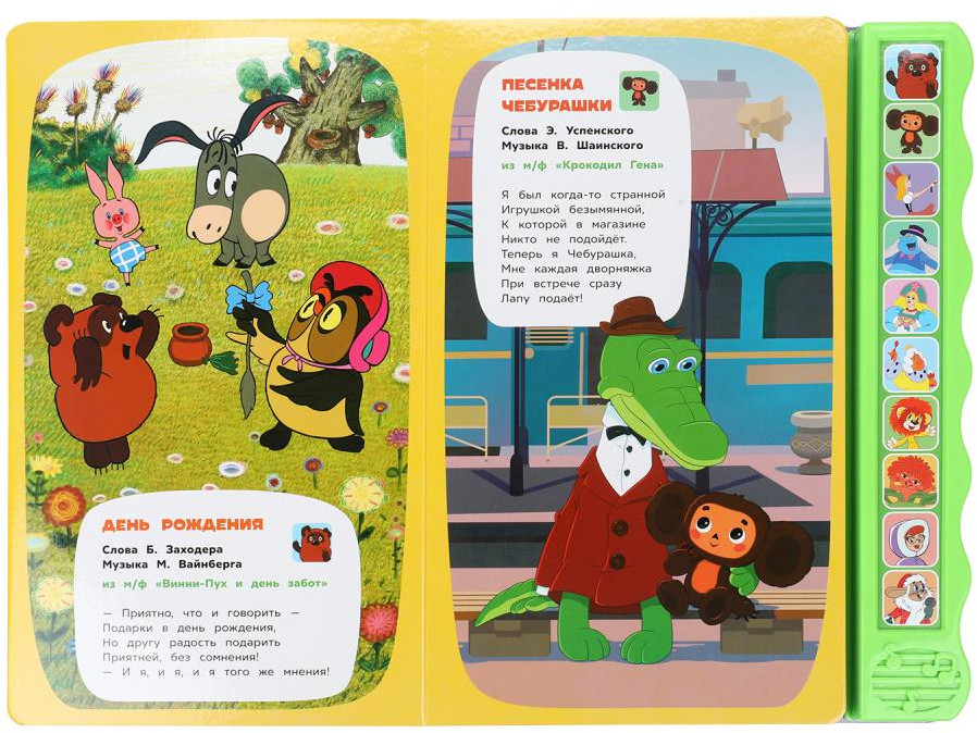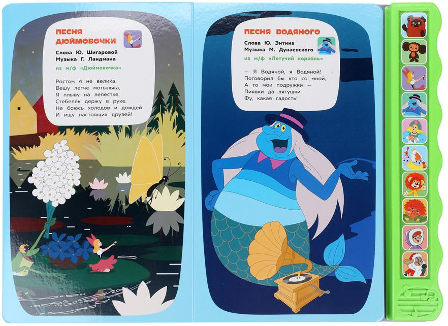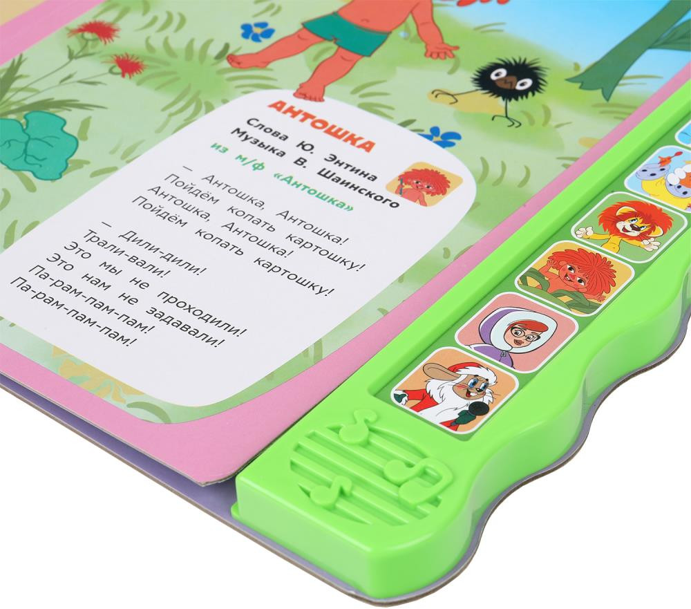 УМка Книга музыкальная «Песенки из любимых мультфильмов»новинка В данный момент этот товар отсутствует в продаже. Возможно, у нас найдется аналогичный или похожий товар здесь. Серия: Союзмультфильм Музыкальная книга «Союзмультфильм. Песенки из любимых мультфильмов» ТМ «УМка» непременно понравится малышу. Маленький любознайка с удовольствием будет рассматривать картинки, нажимать на звуковые кнопки и слушать песенки из популярных детских мультиков. Одно нажатие на кнопку — включится звук, второе нажатие — выключится. Книжка сделана из плотного картона, поэтому родители могут не опасаться за её сохранность. |