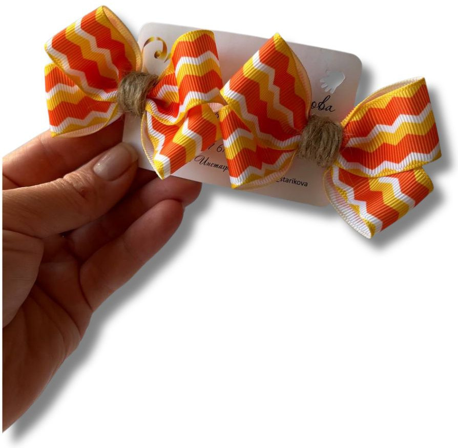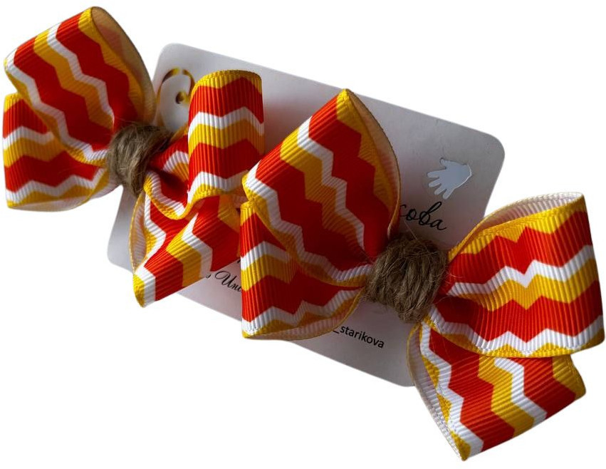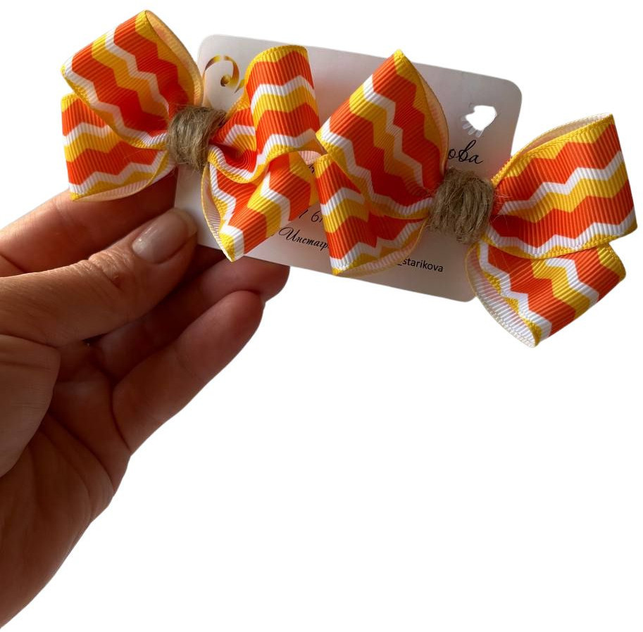 Набор бантиков для волос ручной работы на заколках из 2 штук, зигзаги. Размер бантика 4 × 7 см, длина заколочки (зажима) 4,5 см. Бантики однослойные. Материал — плотная репсовая лента, заколка для волос (зажим) с зубчиками. Каждый набор бантиков упакован в индивидуальную крафт-коробочку, которая может служить и подарочной упаковкой, и для дальнейшего хранения.