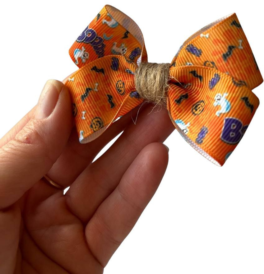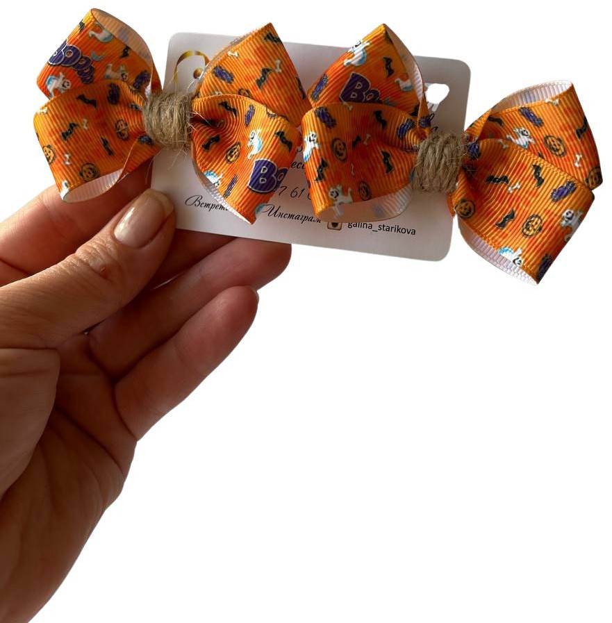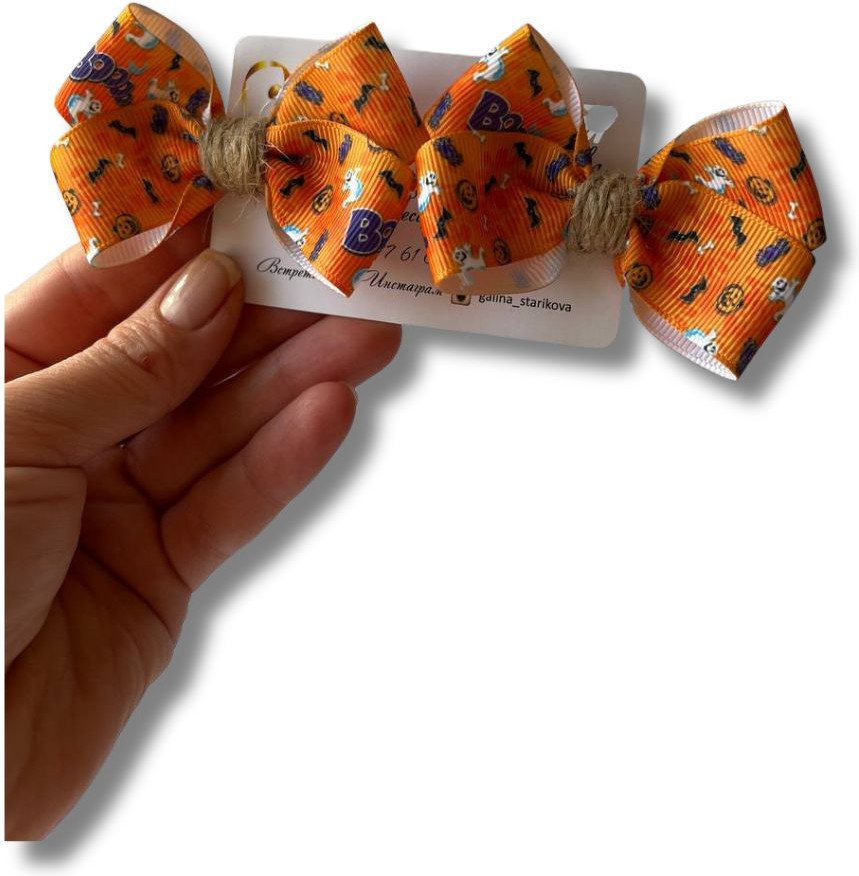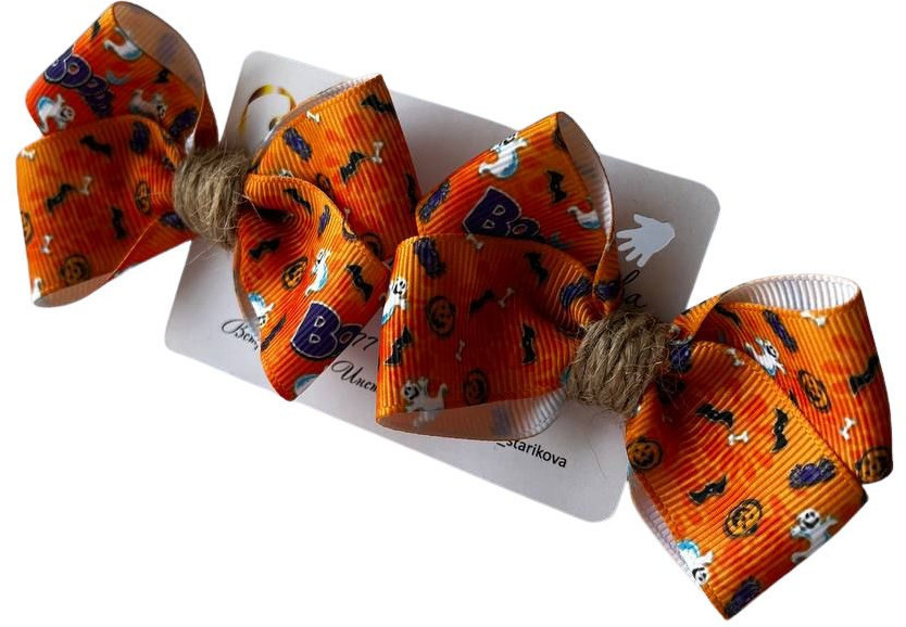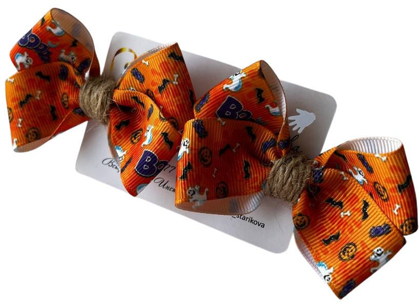 Набор бантиков для волос ручной работы на заколках из 2 штук, Хэллоуин. Размер бантика 4×7 см, длина заколочки (зажима) 4,5 см. Бантики однослойные. Материал — плотная репсовая лента, заколка для волос (зажим) с зубчиками. Каждый набор бантиков упакован в индивидуальную крафт-коробочку, которая может служить и подарочной упаковкой, и для дальнейшего хранения.