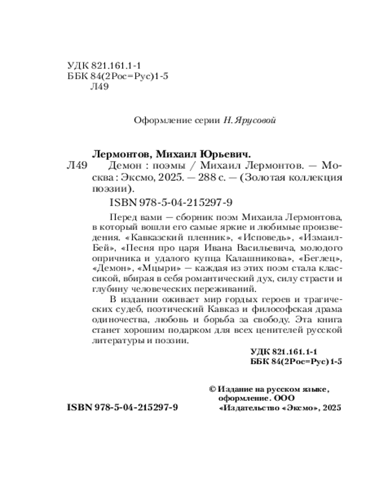Перед вами сборник поэм Михаила Лермонтова, в котором собраны его самые яркие и любимые произведения. «Кавказский пленник», «Исповедь», «Измаил-Бей», «Песня про царя Ивана Васильевича, молодого опричника и удалого купца Калашникова», «Беглец», «Демон», «Мцыри» — каждая из этих поэм стала классикой, вбирая в себя романтический дух, силу страсти и глубину человеческих переживаний. В издании оживает мир гордых героев и трагических судеб, поэтический Кавказ и философская драма одиночества, любовь и борьба за свободу. Эта книга станет ценным подарком для всех ценителей русской литературы и поэзии.