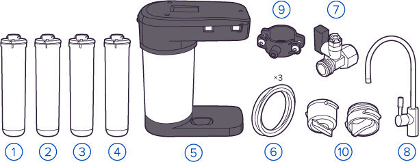 В комплекте: сменный модуль K5; сменный картридж K2; модуль сменный мембранный KО-100S; сменный картридж K7M; корпус DWM в сборе; соединительные трубки (3 шт.), узел подключения; кран для чистой воды; дренажный хомут; сервисная заглушка.