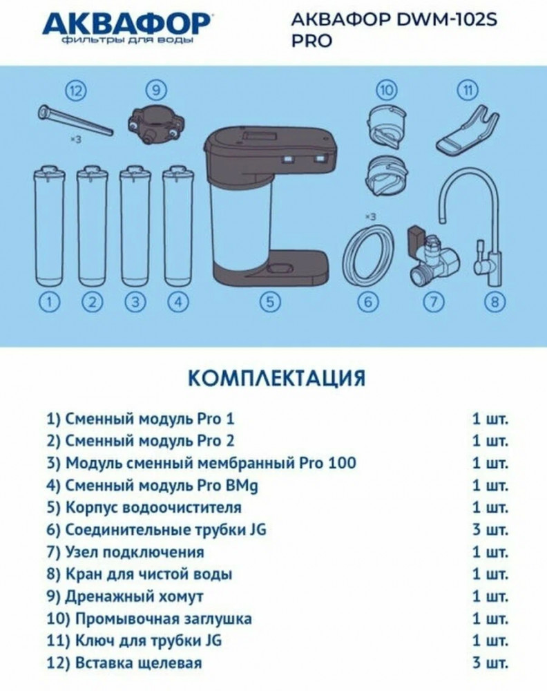 Комплектация: сменный модуль Pro 1 — 1 шт., сменный модуль Pro 2 — 1 шт., сменный модуль Pro 100 — 1 шт., сменный модуль Pro BMg — 1 шт., корпус DWM в сборе — 1 шт., соединительные трубки — 3 шт., узел подключения — 1 шт., кран для чистой воды — 1 шт., дренажный хомут — 1 шт., сервисная заглушка — 1 шт., ключ-вилка — 1 шт. |