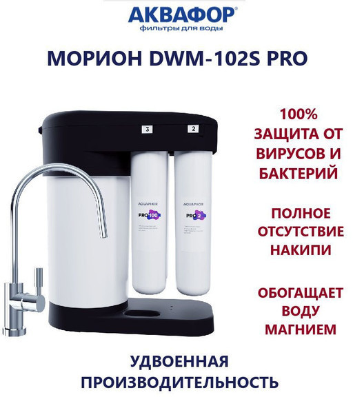В данный момент этот товар отсутствует в продаже. Возможно, у нас найдется аналогичный или похожий товар здесь. DWM-102S Pro очистит даже самую сложную воду, удалив из нее любые примеси: все самые распространенные токсиканты, бактерии и вирусы. Фильтр полностью умягчает воду: из чайника исчезнет накипь, а домашние блюда станут еще вкуснее и полезнее.