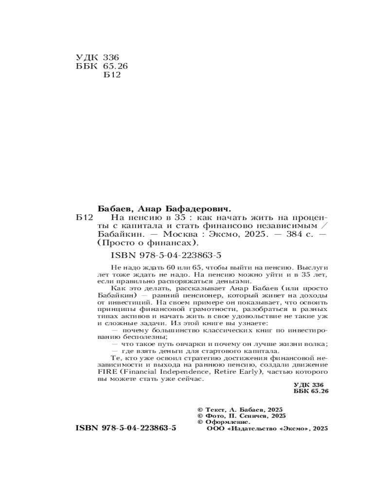 Серия: Просто о финансах Не надо ждать 60 или 65, чтобы выйти на пенсию. Выслуги лет тоже ждать не надо. На пенсию можно уйти и в 35 лет, если правильно распоряжаться деньгами. Как это делать, рассказывает Анар Бабаев (или просто Бабайкин) — ранний пенсионер, который живет на доходы от инвестиций. На своем примере он показывает, что освоить принципы финансовой грамотности, разобраться в разных типах активов и начать жить в свое удовольствие — не такие уж и сложные задачи. Те, кто уже освоил стратегию достижения финансовой независимости и выхода на раннюю пенсию, создали движение FIRE (Financial Independence, Retire Early), частью которого вы можете стать уже сейчас. |