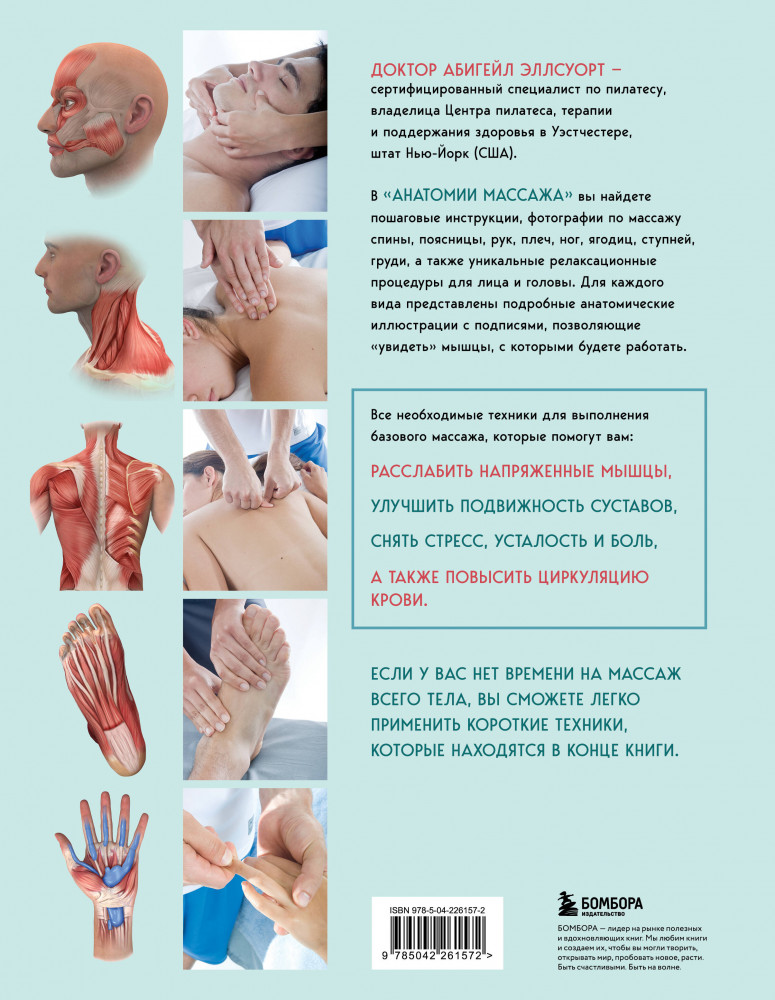 Серия: Анатомия здоровья Хотите расслабить мышцы, улучшить подвижность суставов, избавиться от боли в спине, руках, ногах и шее или снять усталость? Тогда вам нужен качественный массаж. Эта книга поможет вам овладеть ключевыми техниками массажа. В книге «Анатомия массажа» представлен базовый массаж нижней и верхней части тела с анатомическими иллюстрациями. Она будет полезна всем: и новичкам, и специалистам в этой области. Доктор Абигейл Эллсуорт — сертифицированный специалист по пилатесу, владелица Центра пилатеса, терапии и поддержания здоровья в Уэтчестере, штат Нью-Йорк. |