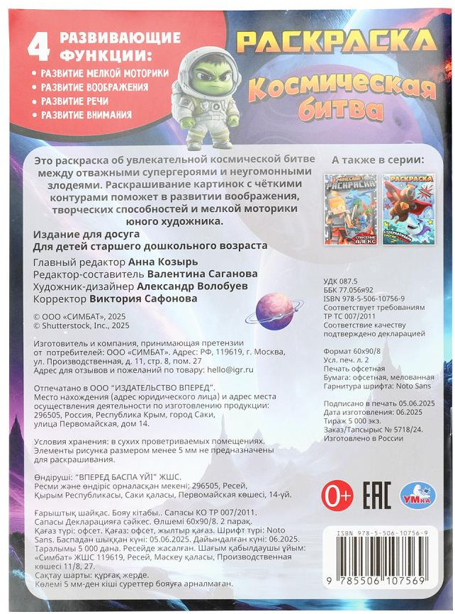 💳 Оплатить за товар можно при получении 🇰🇿 Есть бесплатная доставка по Казахстану 🎁 Копите бонусы с каждой покупки Раскраска «Космическая битва» ТМ «УМка» обязательно понравится юным художникам. Эта занимательная раскраска про приключения отважных супергероев-малышей в космосе не только скрасит досуг ребёнка, но и поможет ему потренировать руку к письму. Внутри детей ожидают интересные картинки с чётким контуром и сюжетные тексты к ним. Благодаря удобному формату раскраску можно взять с собой в дорогу. |