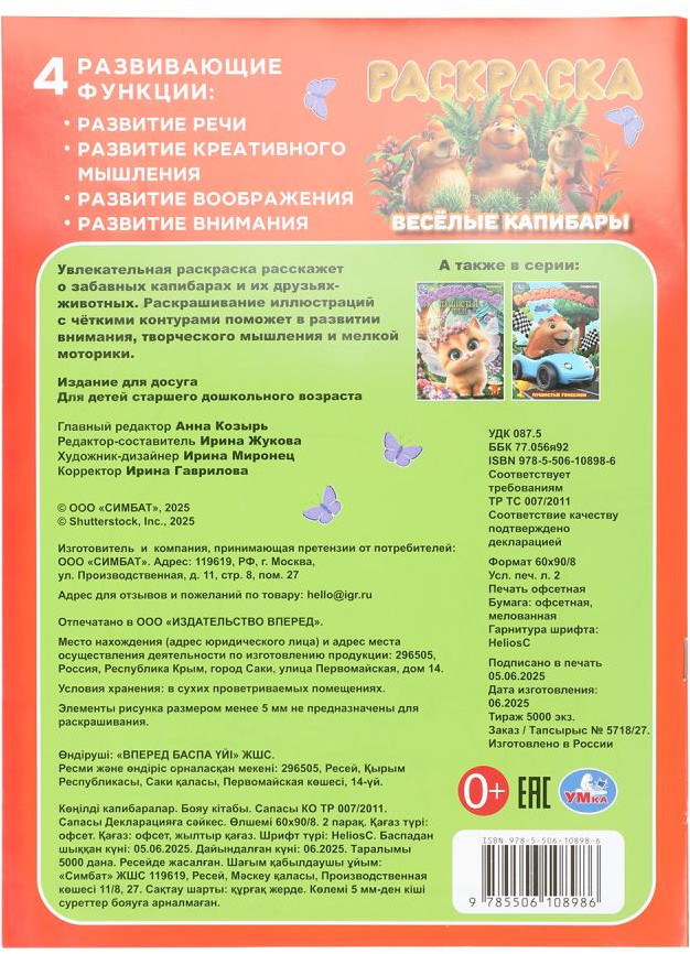 💳 Оплатить за товар можно при получении 🇰🇿 Есть бесплатная доставка по Казахстану 🎁 Копите бонусы с каждой покупки Раскраска «Весёлые капибары» ТМ «УМка» обязательно понравится юным художникам. Эта занимательная раскраска с забавными капибарами не только скрасит досуг ребёнка, но и поможет потренировать руку к письму. Внутри детей ожидают интересные картинки с чётким контуром и сюжетные тексты к ним. Благодаря удобному формату раскраску можно взять с собой в дорогу. |