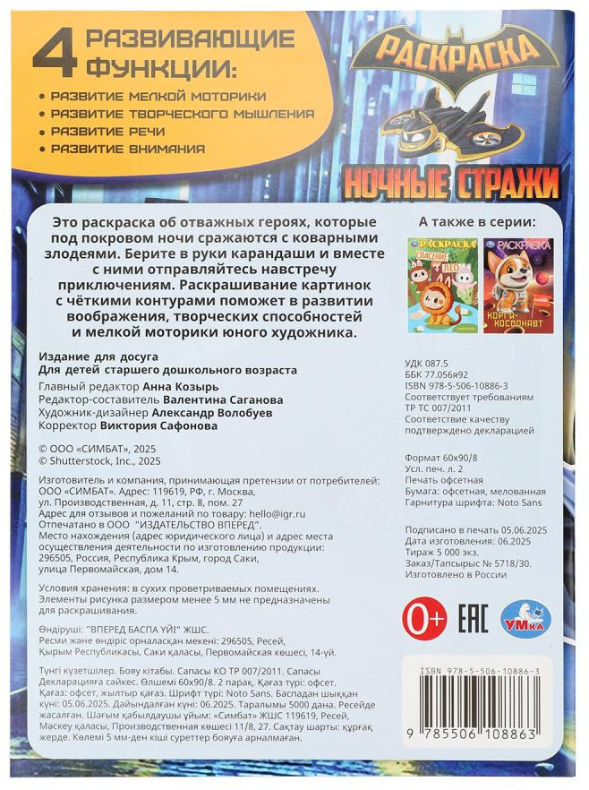 💳 Оплатить за товар можно при получении 🇰🇿 Есть бесплатная доставка по Казахстану 🎁 Копите бонусы с каждой покупки Раскраска «Ночные стражи» ТМ «УМка» обязательно понравится юным художникам. скрасит досуг ребёнка, но и поможет ему потренировать руку к письму. Внутри детей ожидают интересные картинки с чётким контуром и сюжетные тексты к ним. Благодаря удобному формату раскраску можно взять с собой в дорогу. |