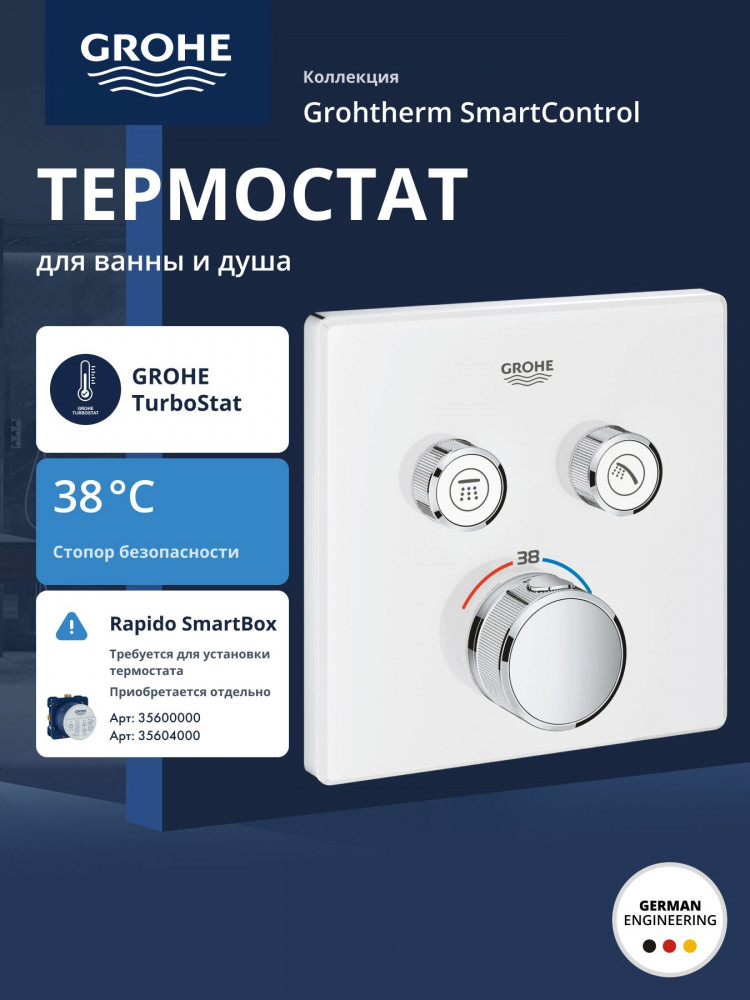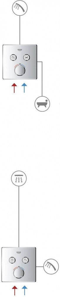 Для установки требуется универсальная встроенный механизм Grohe Rapido SmartBox (35600000). Хромированная поверхность. Кнопочное управление: для открытия воды комфортной температуры достаточно просто нажать кнопку.