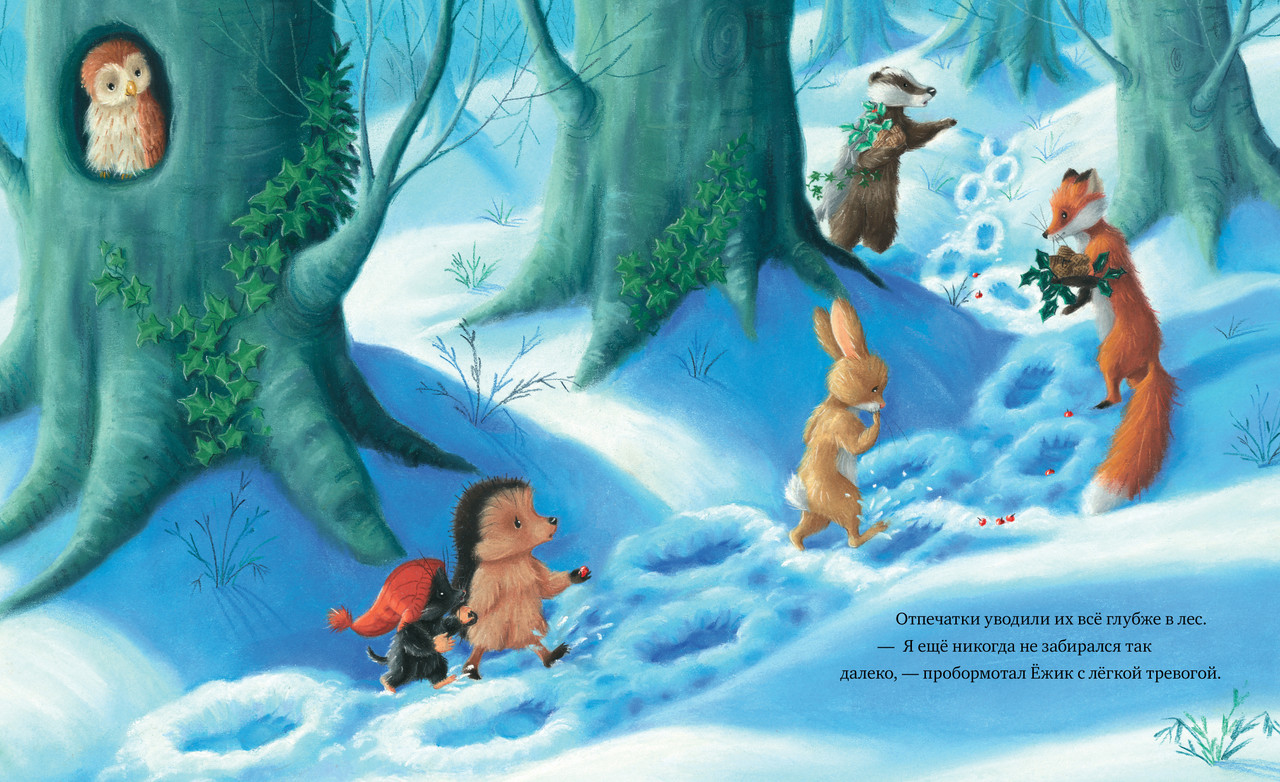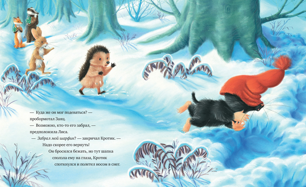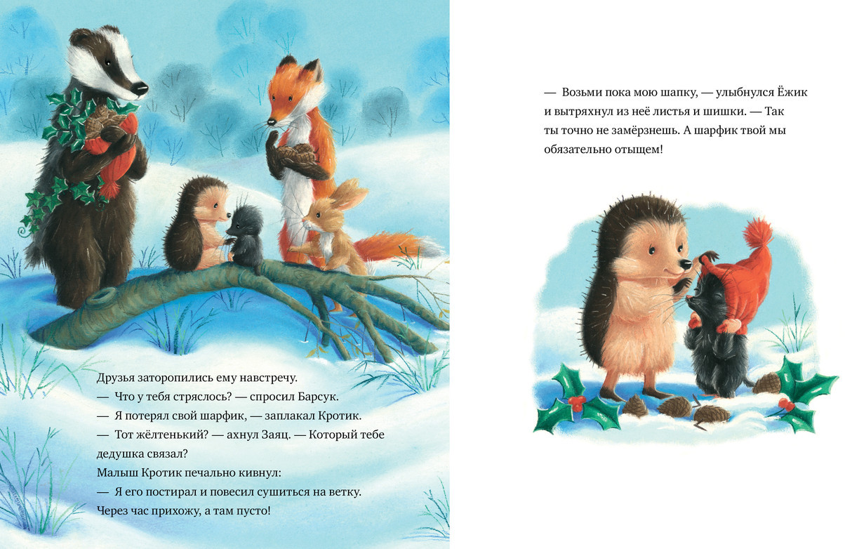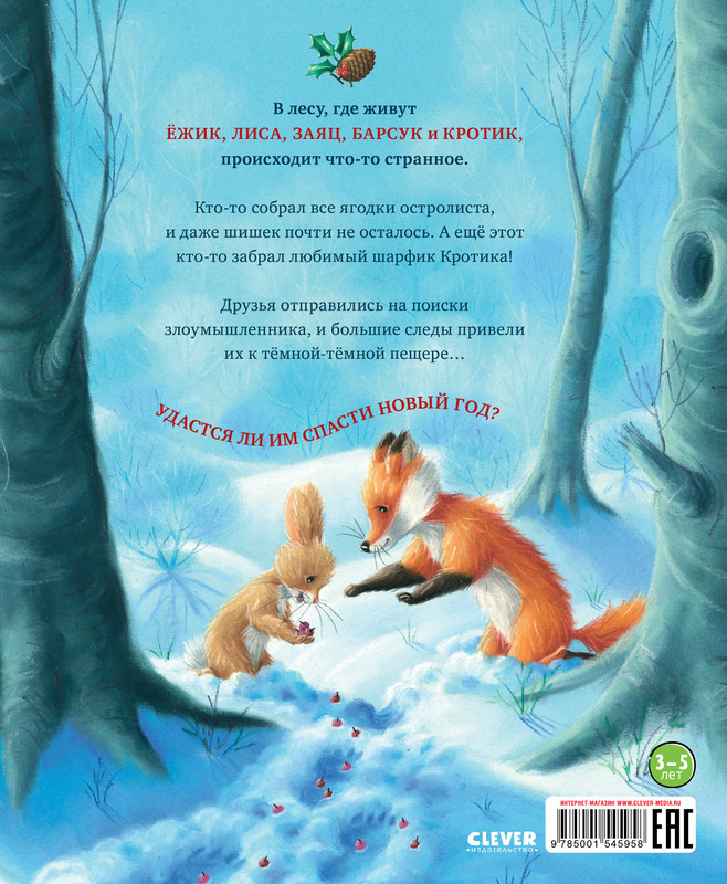 Из новогодней истории ребенок узнает о дружбе, поддержке и взаимопомощи. В лесу, где живут Ежик, Лиса, Заяц, Барсук и Кротик, происходит что-то странное. Кто-то собрал все ягодки остролиста, и даже шишек почти не осталось. А еще этот кто-то забрал любимый шарфик Кротика! Друзья отправились на поиски злоумышленника, и большие следы привели их к темной-темной пещере... Удастся ли им спасти Новый год?