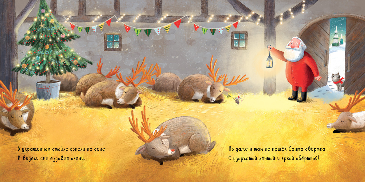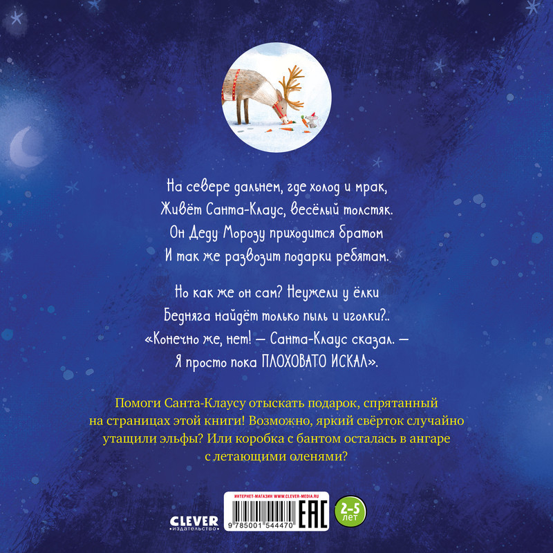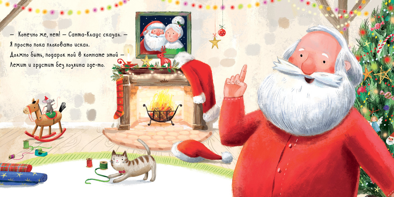 В книге прекрасно всё: удобный формат, красочные иллюстрации, которые хочется рассматривать снова и снова, и новогодняя история про Санта-Клауса в стихотворном переводе известной детской писательницы Елены Фельдман. Вам предстоит помочь Санта-Клаусу найти подарок, спрятанный на страницах этой книги! Возможно, яркий сверток случайно утащили эльфы? Или коробка с бантом осталась в ангаре с летающими оленями?