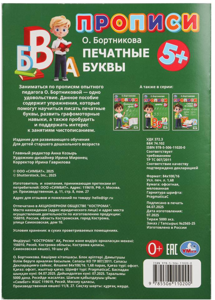 Прописи «О. Бортникова. Печатные буквы» ТМ «УМка» — настоящий тренажёр по чистописанию. На страницах этих прописей ребёнка ожидают занимательные упражнения по авторской методике опытного педагога О. Бортниковой, которые помогут ему научиться писать печатные буквы и развить графомоторные навыки, а также пробудить и поддержать интерес к занятиям чистописанием. Занятия с прописями ТМ «УМка» помогают подготовить руку к письму и способствуют развитию: мелкой моторики рук, памяти, речи, внимания, творческого мышления и усидчивости. |