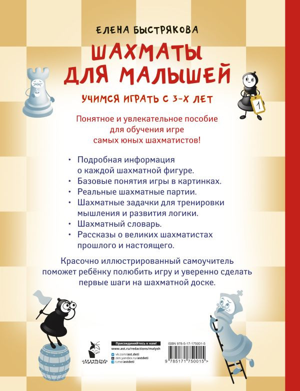 Серия: Большой самоучитель для маленьких «Шахматы для малышей. Учимся играть с 3-х лет» — это иллюстрированный самоучитель, который шаг за шагом откроет ребёнку удивительный мир шахмат. Простые объяснения и красочные иллюстрации превратят знакомство с правилами интеллектуальной игры в увлекательное приключение. Автор книги — Елена Витальевна Быстрякова, детский шахматный тренер, бронзовый призёр первенства СССР 1983 года и шестикратная чемпионка Ленинграда среди женщин. Она в лёгкой и доступной манере рассказывает, как двигаются фигуры, что значит «шах» и «мат» и как сыграть свою первую партию. Плотные страницы и крупные картинки делают издание удобным для самых маленьких читателей. |