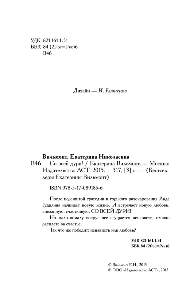 Серия: Бестселлеры Екатерины Вильмонт После пережитой трагедии и горького разочарования Лада Гудилина начинает новую жизнь. И встречает новую любовь, внезапно счастливую, со всей дури! Но мало-помалу вокруг нее сгущается ненависть, словно расплата за счастье. Так что же победит: ненависть или любовь? |
