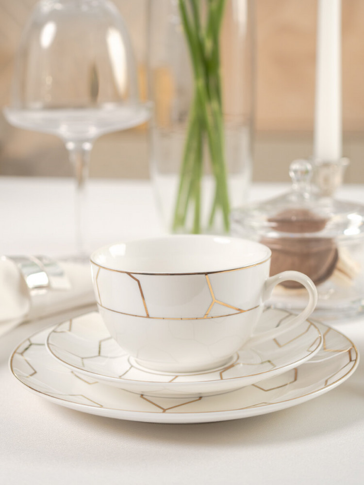 Серия: Mari Изящная серия Mari выполнена из тонкостенного фарфора в стиле ар-деко. Коллекция посуды создана в разных цветовых комбинациях и рисунках с техникой нанесения подглазурной деколи. Такая техника гарантирует, что рисунок со временем не померкнет. Специальный метод нанесения золотого канта позволяет использовать посуду в СВЧ и морозильной камере. Все изделия коллекции имеют индивидуальную упаковку и станут прекрасным подарком для близких. |