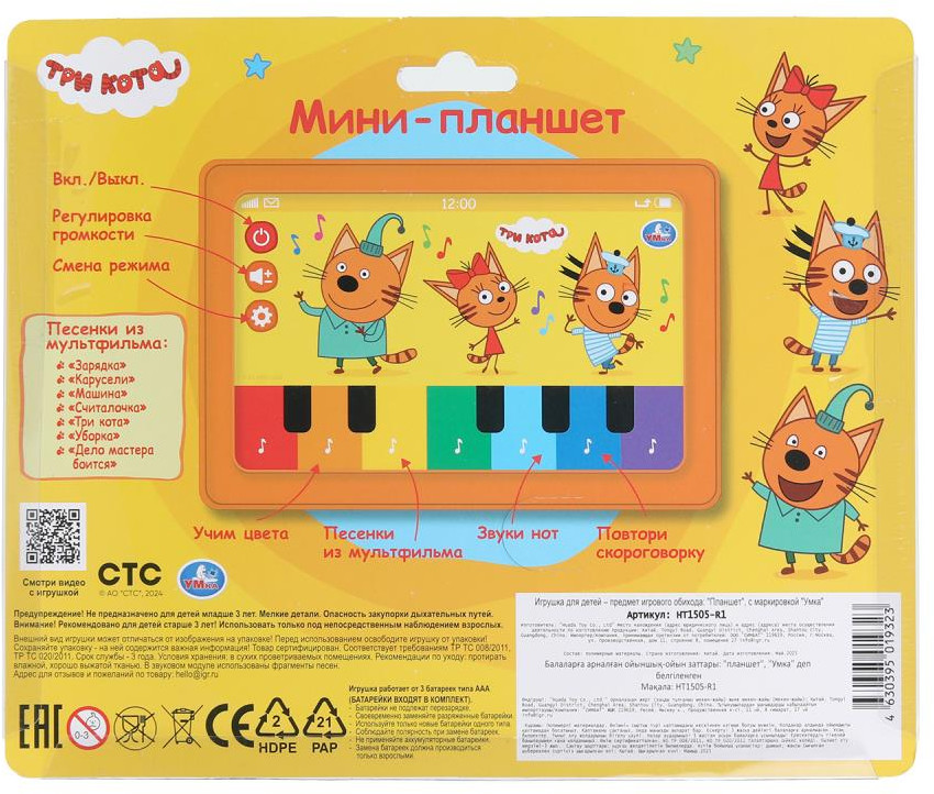 Серия: Три кота Мини-планшет «Три кота» ТМ «УМка» станет прекрасным подарком для маленьких поклонников одноимённого мультсериала. Игрушка-планшет — креативный и полезный подарок для развития и игры. Малыш с удовольствием будет нажимать на кнопки и слушать весёлые песенки, запоминать забавные скороговорки, а также в игровой манере знакомиться с понятием «цвет». Благодаря небольшому размеру планшет удобно брать с собой на прогулку или в дорогу. |
