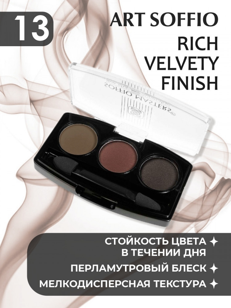 Это шелковистая мелкодисперсная текстура, волшебный перламутровый блеск и стойкость цвета в течении дня. Rich velvety finish — богатый бархатистый эффект! Эксклюзивная формула, исключительно чистый цвет и легкость при нанесении. Гармоничное сочетание из трех оттенков, оригинальная палитра и шелковистая текстура, позволяют создать неповторимый макияж. Это продукция нового поколения make-up, которая сочетает в себе насыщенный цвет и уход за кожей. Текстура теней, невесомая и эластичная, обеспечивает максимально равномерное нанесение, а особый перламутр создает жемчужное сияние и дополнительно добавляет хорошую стойкость и укрывистость. Легко регулируется плотность и интенсивность цвета.