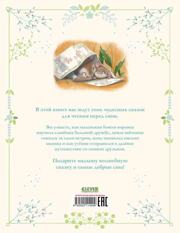 В этой книге вас ждут семь чудесных сказок для чтения перед сном. Вы узнаете, как маленькая божья коровка научила слонёнка большой дружбе, зачем зайчонок гонялся за злым ветром, кому написала письмо мышка и как утёнок отправился в далёкое путешествие со своими друзьями. Подарите малышу волшебную сказку и самые добрые сны!