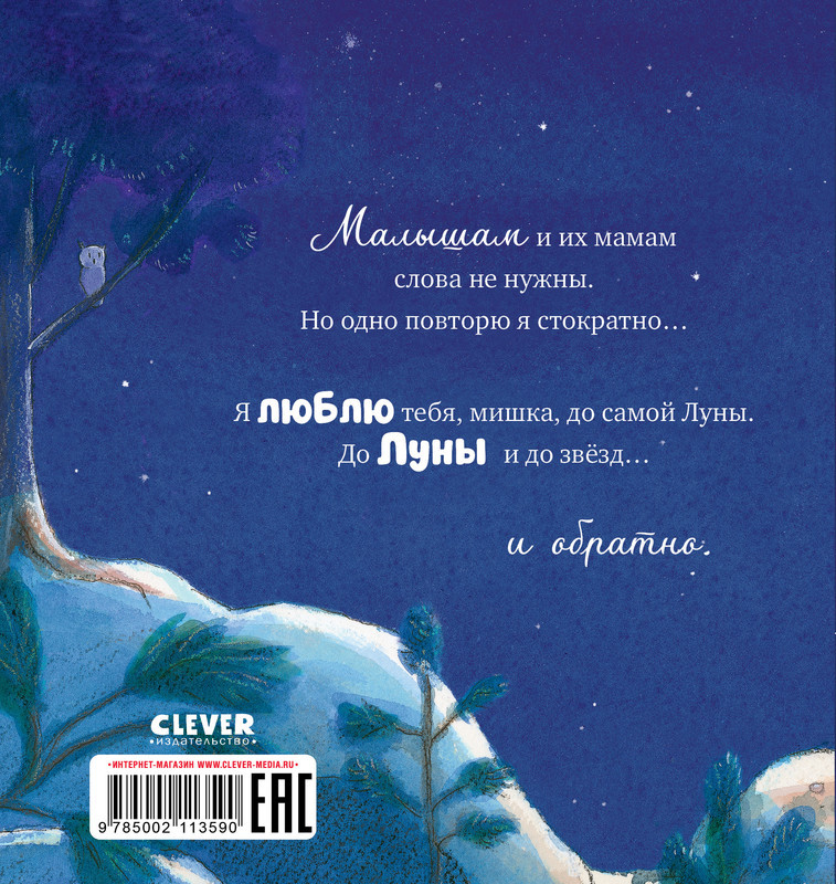 «Люблю тебя до Луны и обратно» — книжка-картинка, сказка о нежной и безграничной маминой любви. Перевела книжку талантливый писатель Елена Фельдман, а иллюстрации на страницах понравятся и вам, и малышу.