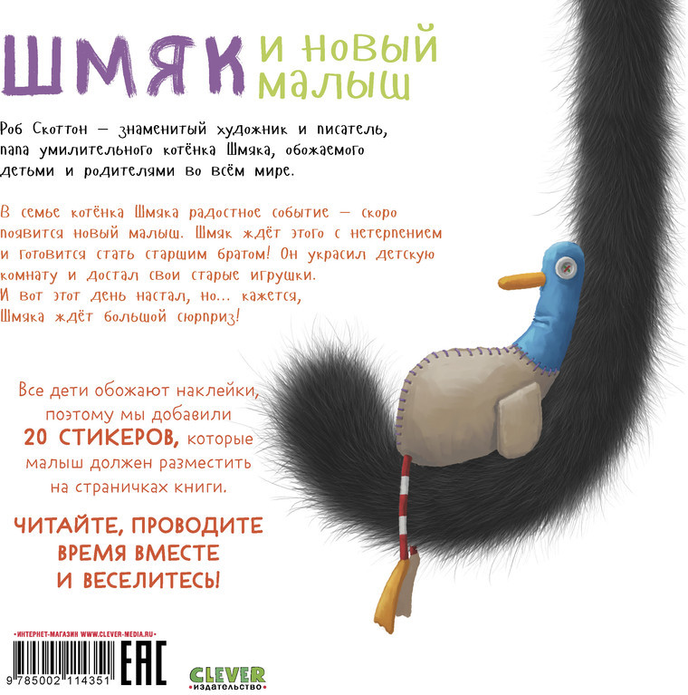 В данный момент этот товар отсутствует в продаже. Возможно, у нас найдется аналогичный или похожий товар здесь. Серия: Котенок Шмяк В семье котенка Шмяка радостное событие — скоро появится новый малыш. Шмяк ждёт этого с нетерпением и готовится стать старшим братом! Он украсил детскую комнату и достал свои старые игрушки. И вот этот день настал, но... кажется, Шмяка ждёт большой сюрприз! Все дети обожают наклейки, поэтому мы добавили 20 стикеров, которые малыш должен разместить на страничках книги. Читайте, проводите время вместе и веселитесь!