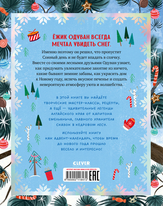 Главный герой книжки — ежик Одуван, который решил не ложиться спать зимой, — поможет украсить дом, расскажет о зимних забавах. А главный хранитель сказок кедрового леса Капитон Емельяныч раскроет тайны удивительных легенд.