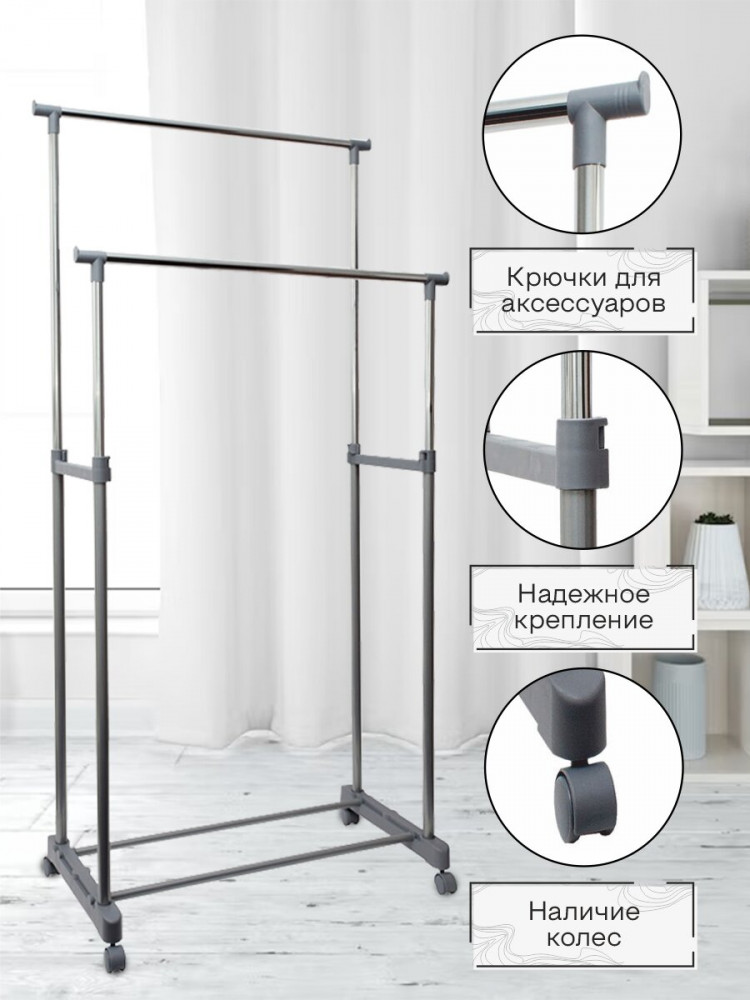 • регулировка высоты — вы можете выбрать оптимальную высоту для каждой вешалки, чтобы разместить одежду разных размеров;