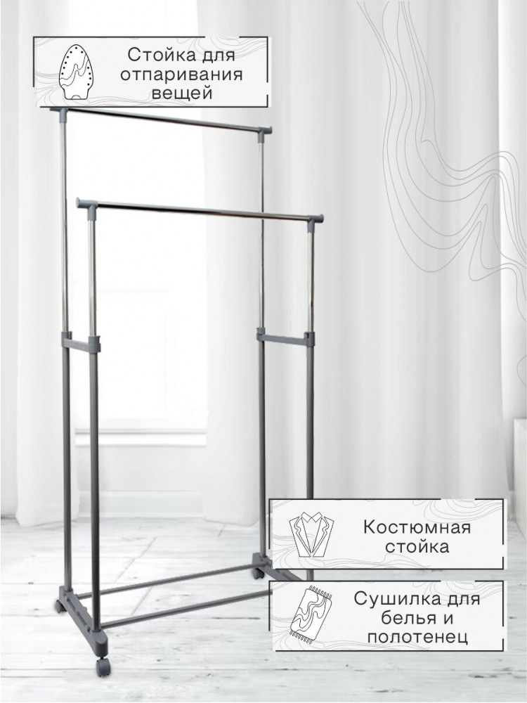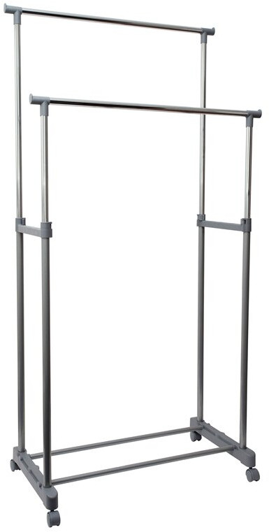 Двойное вешало для одежды станет прекрасным помощником в организации пространства гардеробной, прихожей, комнате или коридоре. Практичное и удобное вешало изготовлено из стали и высококачественного пластика. Имеет компактный размер. Мобильность вешала обеспечивается наличием колесиков. Максимальная нагрузка 20 кг.