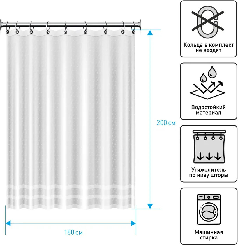 Штора для ванной — незаменимый и практичный аксессуар современной ванной. Шторы предотвращают попадание брызг воды, мыльной пены на пол и стены ванной комнаты. Штора для ванной имеет металлические люверсы (12 шт), которые защищают шторы от случайного разрыва в местах навешивания. Пластиковые кольца не входят в комплект. Размер шторы 180×200 см. Штора выполнена из водонепроницаемого материала — полиэстер. Он плотный, прочный, обладает водоотталкивающими свойствами, идеально подойдет для ванны, рисунок не выцветает и не тускнеет. |