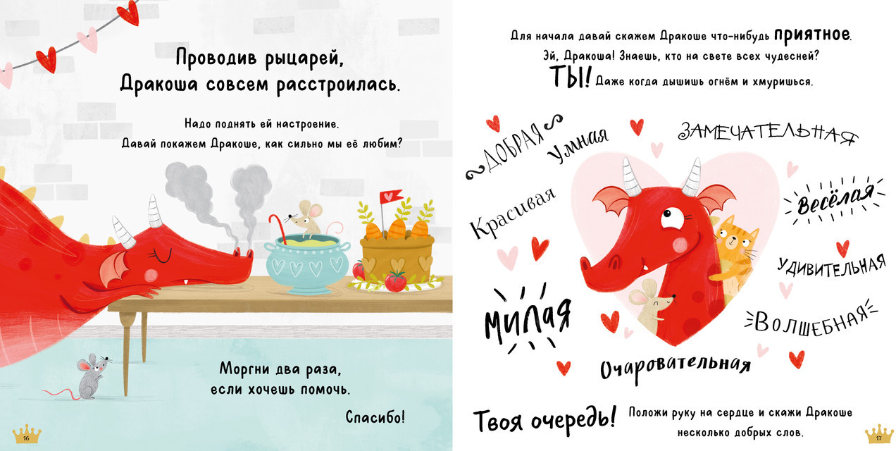 Серия: Книжки-картинки Эта книга с яркими картинками научит малыша успокаиваться и принимать свои эмоции. Ш-Ш-Ш, ты тоже это слышишь? Наша Дракоша очень расстроена. Сегодня её самый любимый праздник — День дружбы! Она ждала его целый год, но вот беда именно сегодня все друзья заняты чем то важным. Чтобы помочь успокоиться Дракоше, ребёнку надо посчитать до десяти, погладить по чешуйчатой спинке, сделать комплимент, рассмешить и даже потанцевать! |