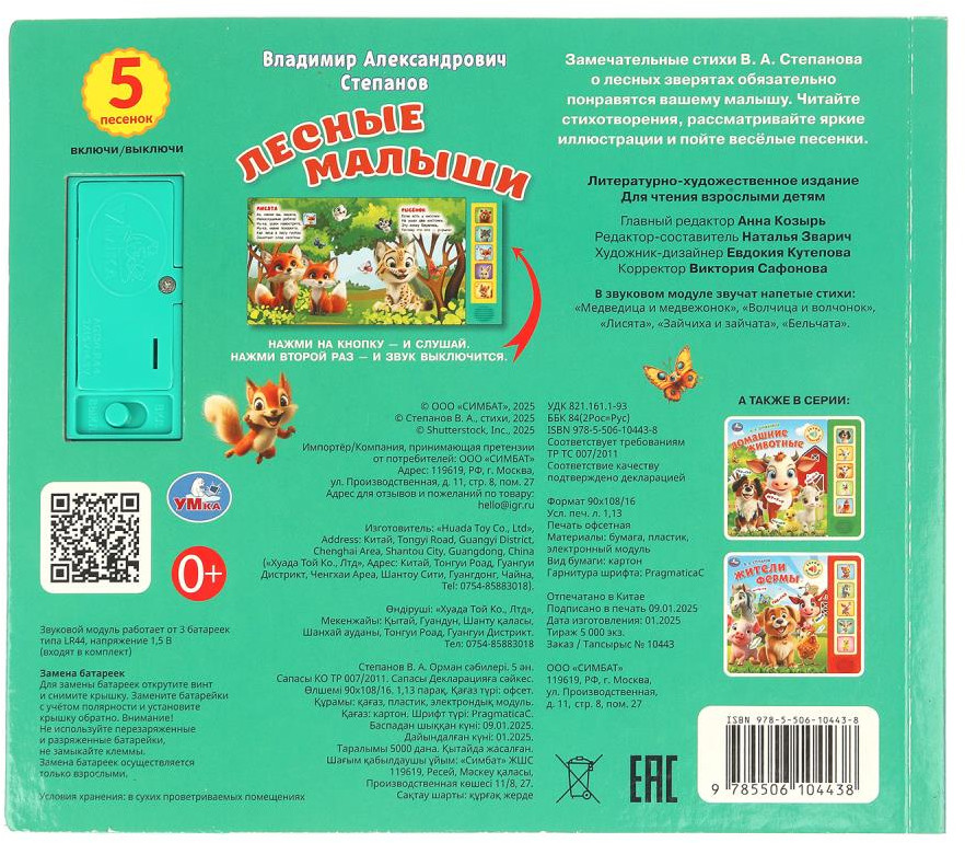 Серия: 5 кнопок Музыкальная книга «В. А. Степанов. Лесные малыши» ТМ «УМка» станет прекрасным подарком для маленького любознайки. Красочная музыкальная книга познакомит малыша с лесными зверятами. Напетые стихи сделают чтение ещё более увлекательным. Ребёнок легко освоит включение звука: по нажатию на кнопку звук включится, при втором нажатии выключится. Книжка сделана из плотного картона, поэтому родители могут не опасаться за её сохранность. Благодаря компактному формату её удобно брать с собой. |