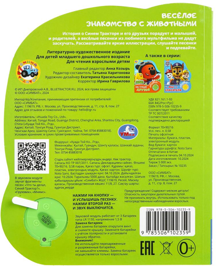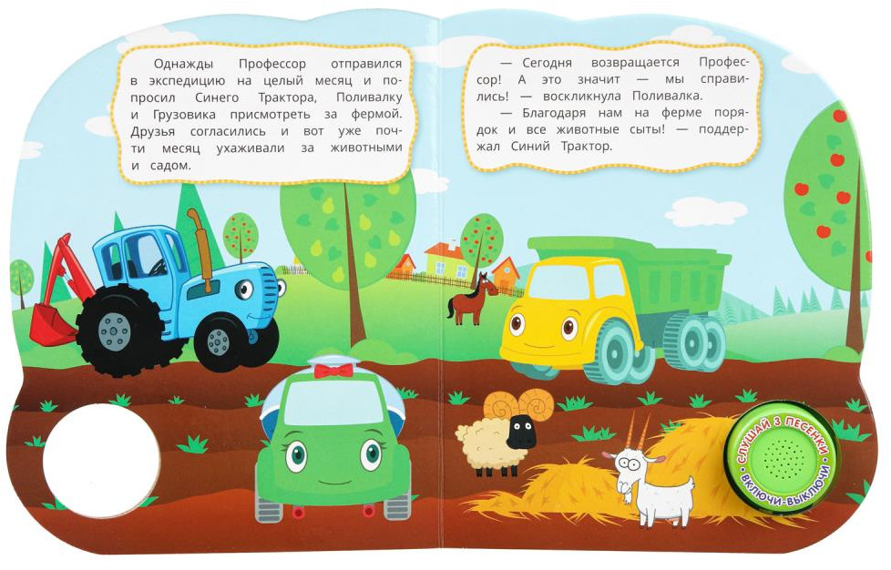 Серия: Синий трактор Музыкальная книга «Синий Трактор. Весёлое знакомство с животными» ТМ «УМка» станет прекрасным подарком для малыша. Ребёнок с удовольствием будет листать плотные страницы, рассматривать яркие картинки с забавными животными и , конечно, нажимать на кнопку и слушать весёлые песенки. Малыш легко освоит включение звука: по нажатию на кнопку песенка включится, при втором нажатии выключится, при третьем — заиграет следующая композиция. Интересный дизайн обложки с блестящими глазками сделает игру с книгой ещё более занимательной. Благодаря компактному размеру книгу удобно взять с собой в дорогу. |