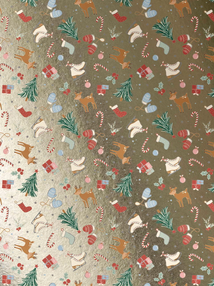 Новогодняя фольгированная бумага для сувенирной продукции в листах размером 100×70 см, с полноцветным декоративным рисунком (свернута в рулончик). Бумага полностью покрыта сияющим слоем, отражающим свет и переливающимся в лучах новогодних гирлянд. Рисунки для такой подарочной упаковочной бумаги также выбраны самые праздничные и новогодние. |