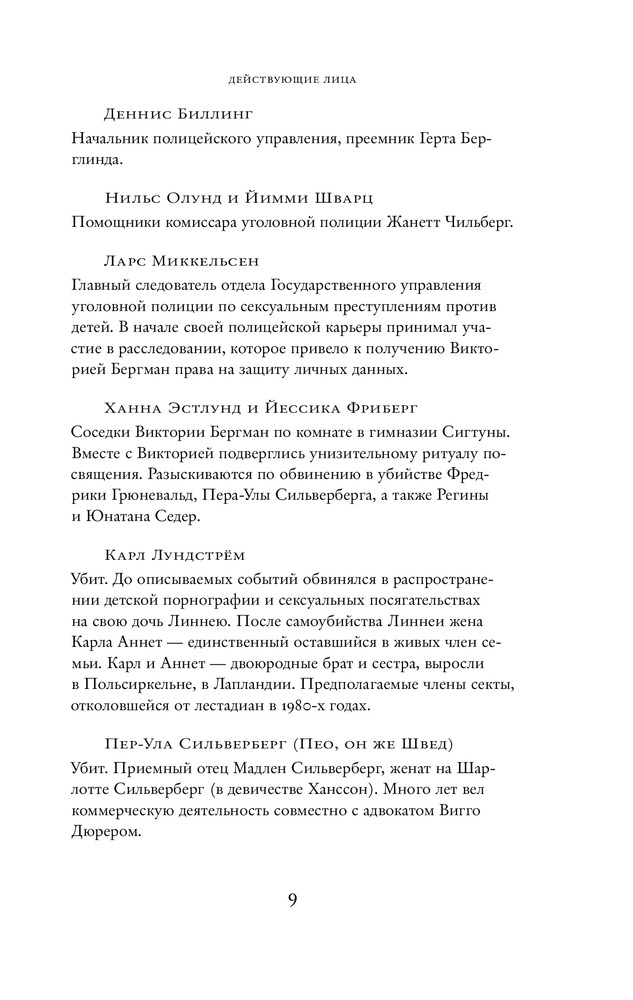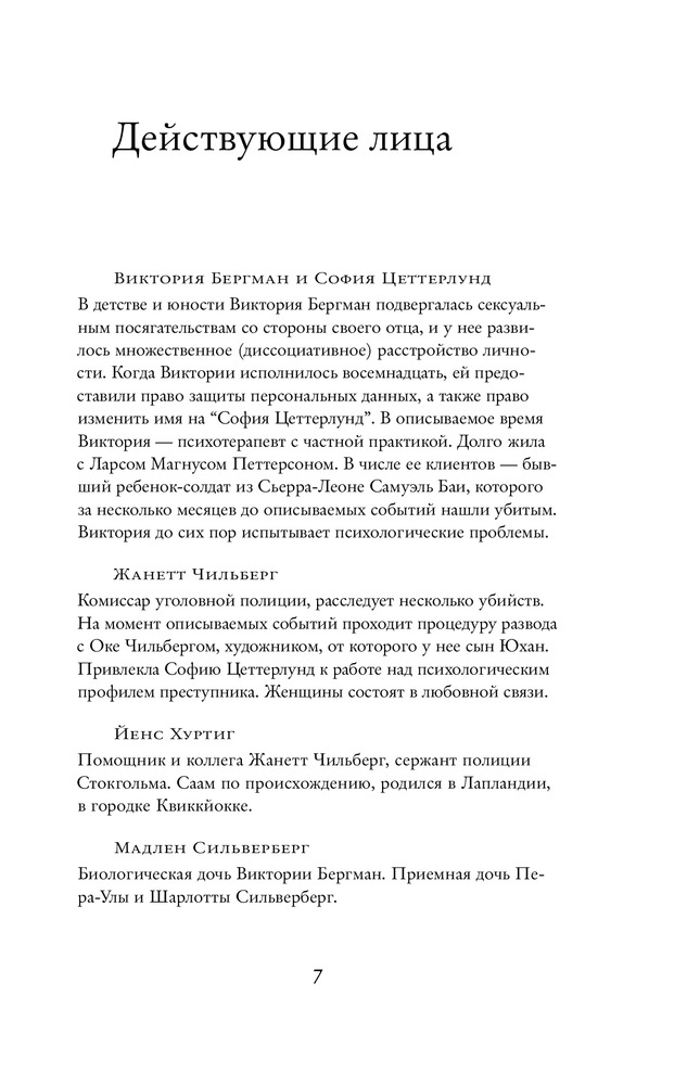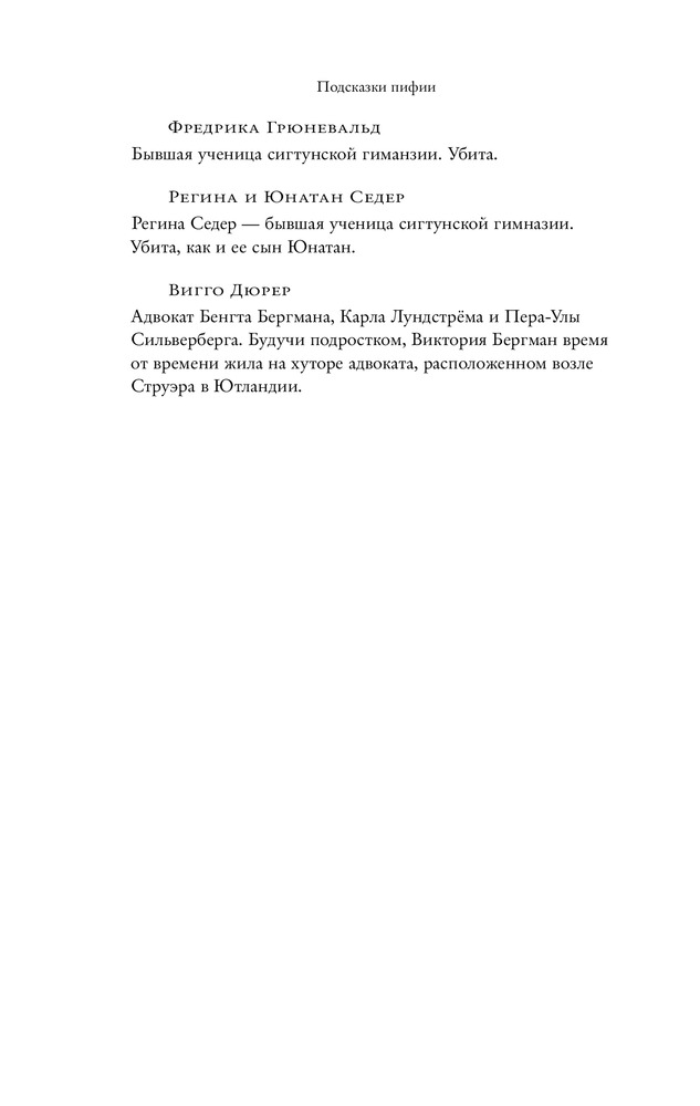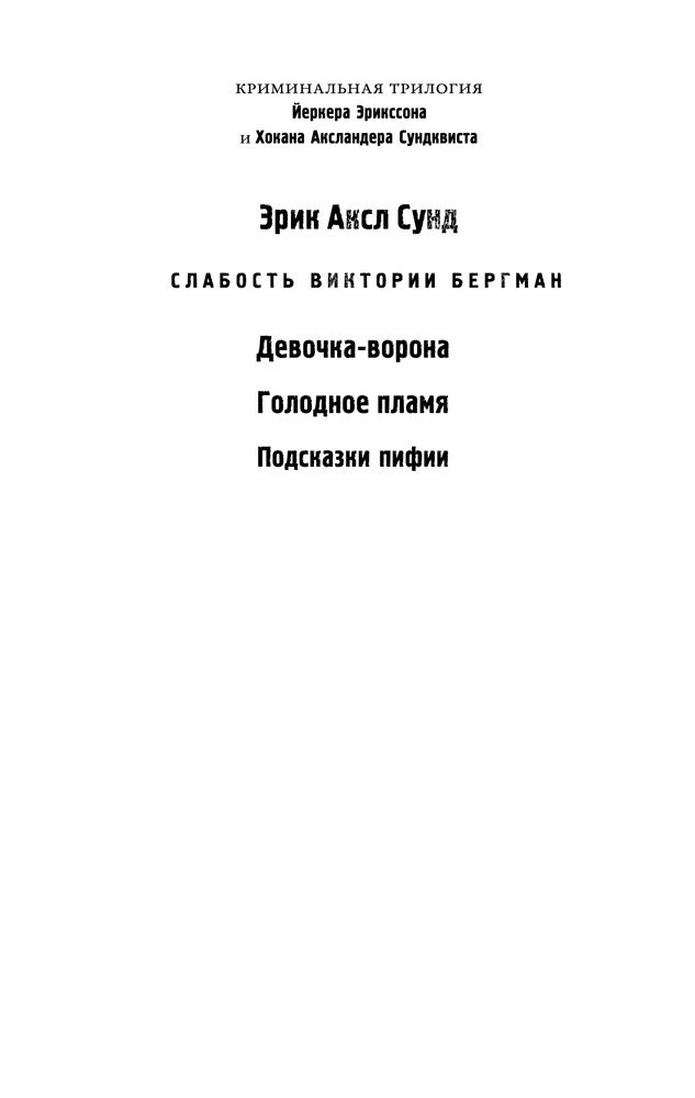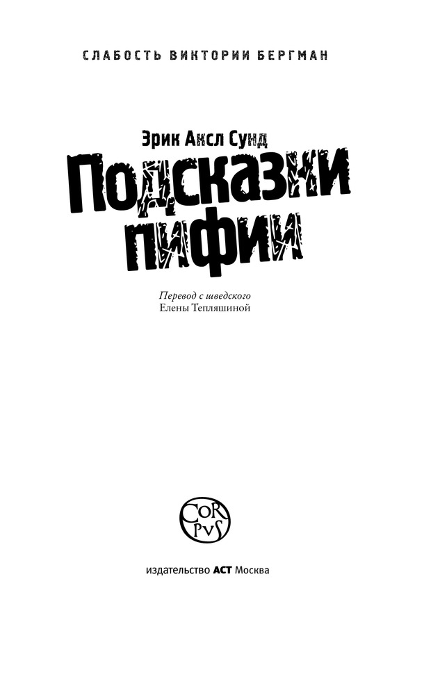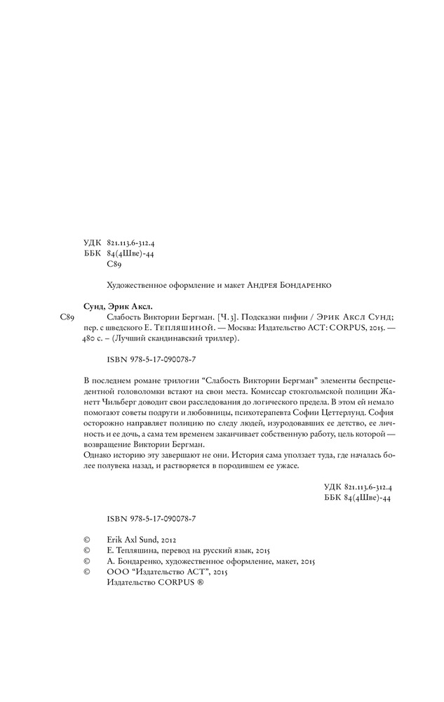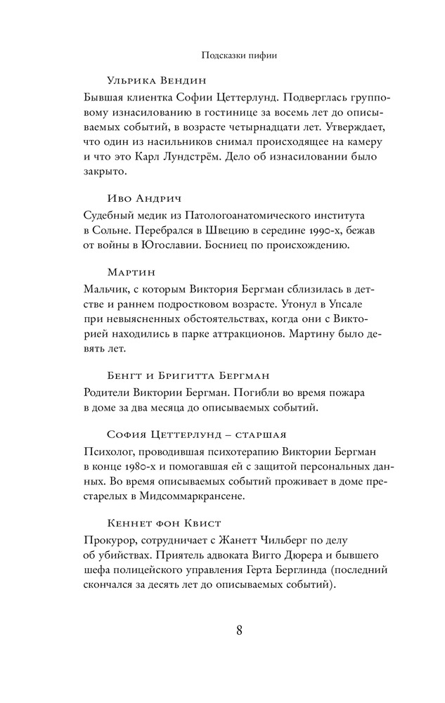 Подсказки пифииВ данный момент этот товар отсутствует в продаже. Возможно, у нас найдется аналогичный или похожий товар здесь. Серия: Лучший скандинавский триллер В последнем романе трилогии “Слабость Виктории Бергман” элементы беспрецедентной головоломки встают на свои места. Комиссар стокгольмской полиции Жанетт Чильберг доводит свои расследования до логического предела. В этом ей немало помогают советы подруги и любовницы, психотерапевта Софии Цеттерлунд. София осторожно направляет полицию по следу людей, изуродовавших ее детство, ее личность и ее дочь, а сама тем временем заканчивает собственную работу, цель которой —возвращение Виктории Бергман. Однако историю эту завершают не они. История сама уползает туда, где началась более полувека назад, и растворяется в породившем ее ужасе. |