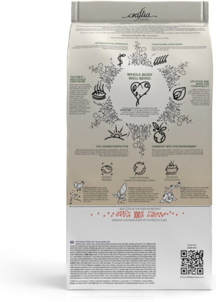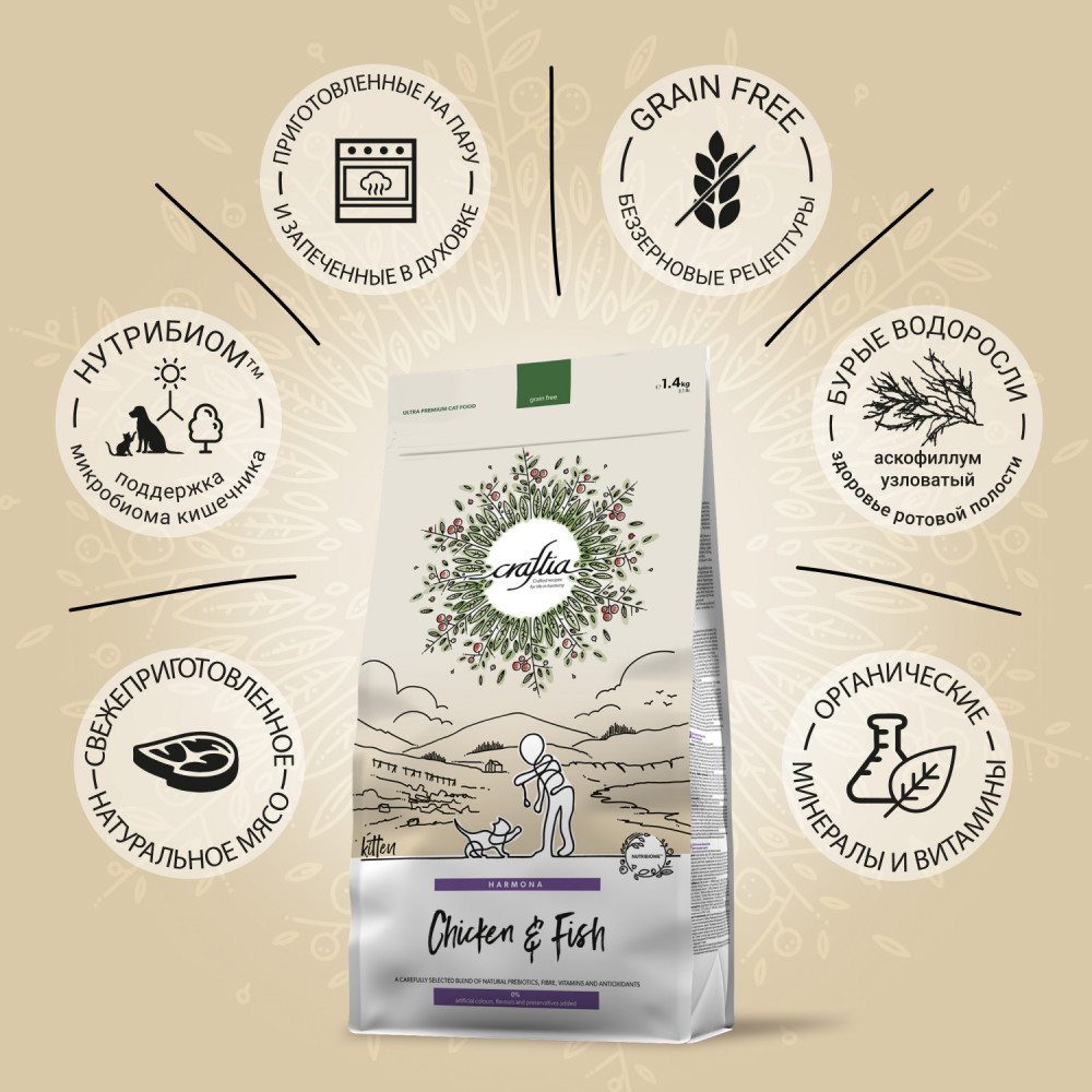 Craftia Harmona — корм для кошек ультрапремиум класса, созданный с любовью к природе. Состав кормов Craftia прозрачен и понятен, отсутствуют скрытые добавки и сомнительные ингредиенты. Все, что заявлено в составе корма, гарантированно присутствует в каждой грануле. Собственный завод, сотни квадратных метров научно-исследовательских лабораторий, первоклассное сырье — все это позволяет создавать тщательно сбалансированный высокобелковый корм с холистическим подходом. Все компоненты корма подходят для употребления человеком и не содержат ГМО.