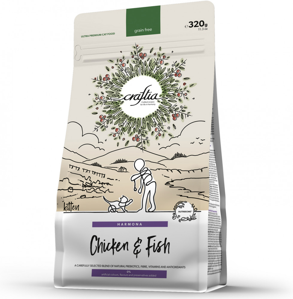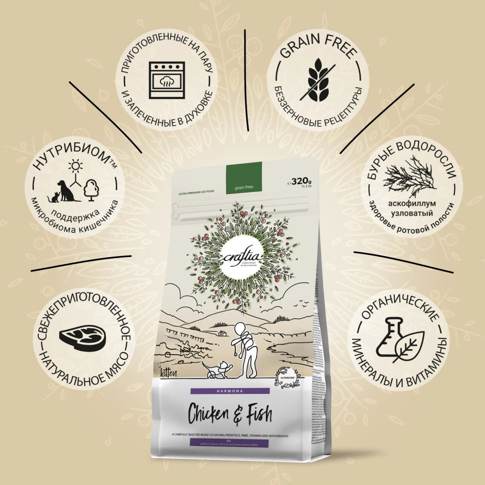 Craftia Harmona — корм для кошек ультрапремиум класса, созданный с любовью к природе. Состав кормов Craftia прозрачен и понятен, отсутствуют скрытые добавки и сомнительные ингредиенты. Все, что заявлено в составе корма, гарантированно присутствует в каждой грануле. Собственный завод, сотни квадратных метров научно-исследовательских лабораторий, первоклассное сырье — все это позволяет создавать тщательно сбалансированный высокобелковый корм с холистическим подходом. Все компоненты корма подходят для употребления человеком и не содержат ГМО.