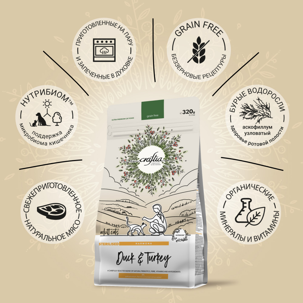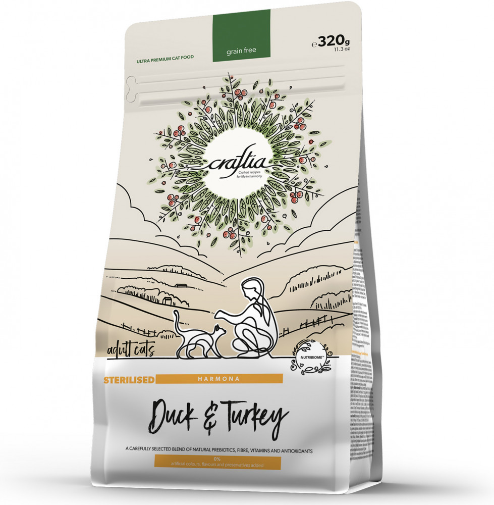Craftia Harmona — корм для кошек ультрапремиум класса, созданный с любовью к природе. Состав кормов Craftia прозрачен и понятен, отсутствуют скрытые добавки и сомнительные ингредиенты. Все, что заявлено в составе корма, гарантированно присутствует в каждой грануле. Собственный завод, сотни квадратных метров научно-исследовательских лабораторий, первоклассное сырье — все это позволяет создавать тщательно сбалансированный высокобелковый корм с холистическим подходом. Все компоненты корма подходят для употребления человеком и не содержат ГМО.