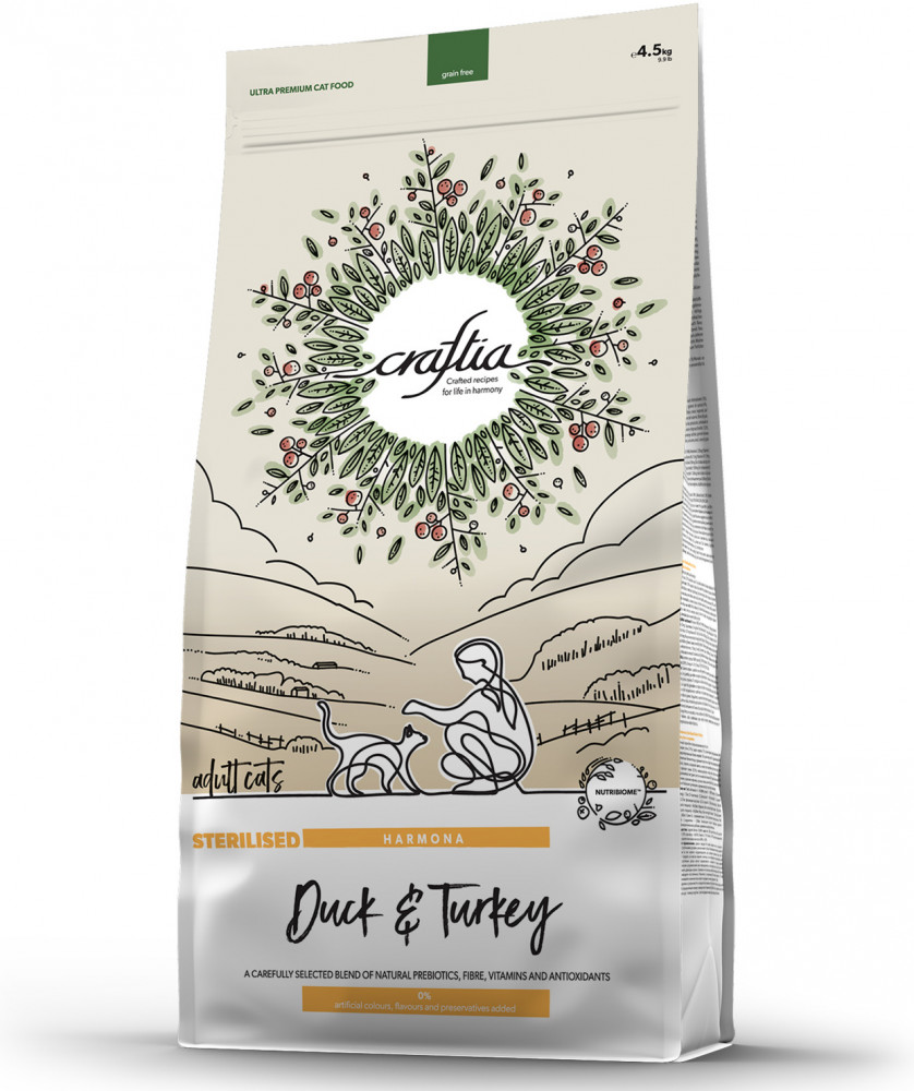 Craftia Harmona — корм для кошек ультрапремиум класса, созданный с любовью к природе. Состав кормов Craftia прозрачен и понятен, отсутствуют скрытые добавки и сомнительные ингредиенты. Все, что заявлено в составе корма, гарантированно присутствует в каждой грануле. Собственный завод, сотни квадратных метров научно-исследовательских лабораторий, первоклассное сырье — все это позволяет создавать тщательно сбалансированный высокобелковый корм с холистическим подходом. Все компоненты корма подходят для употребления человеком и не содержат ГМО.