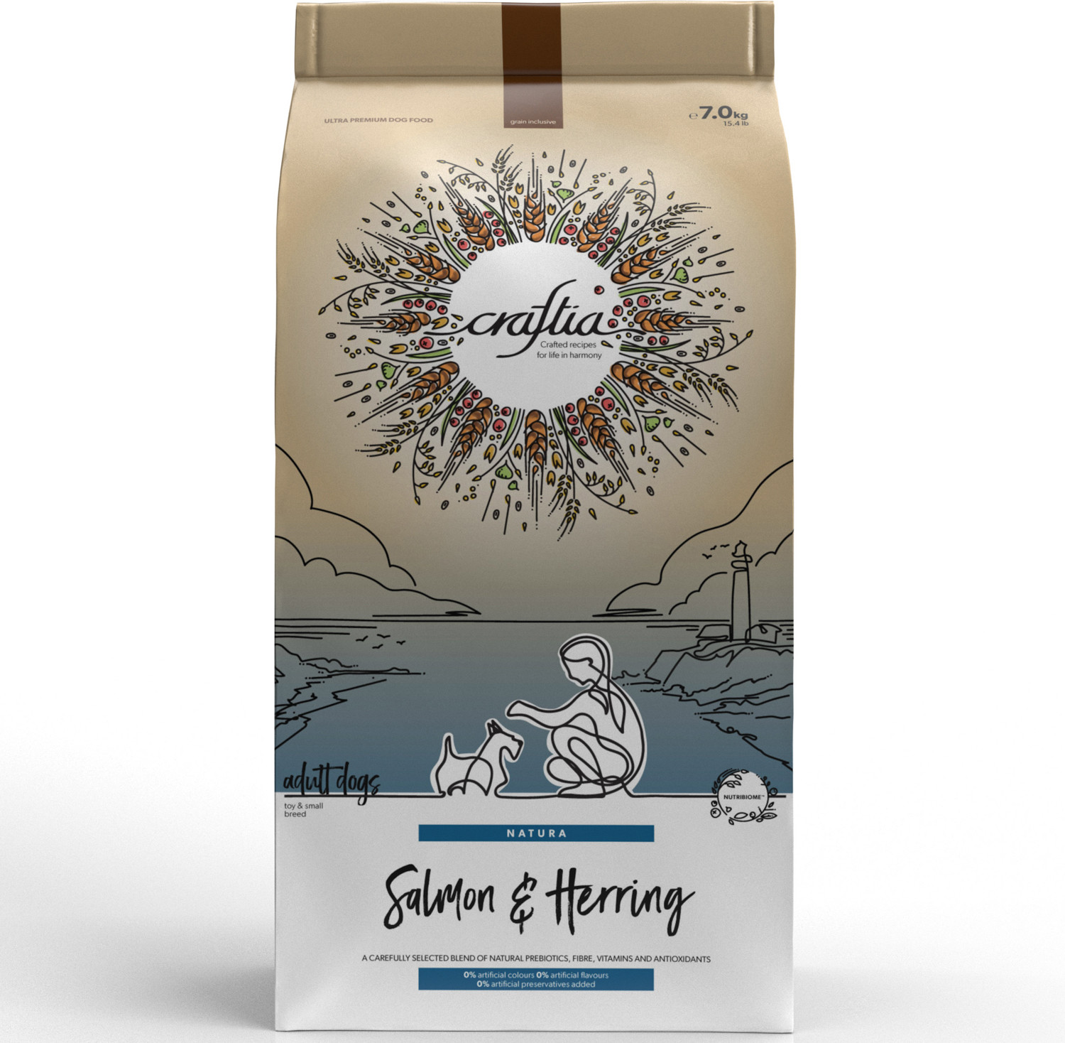 Корм для взрослых собак миниатюрных и мелких пород из лосося с сельдью «Natura» | Craftia