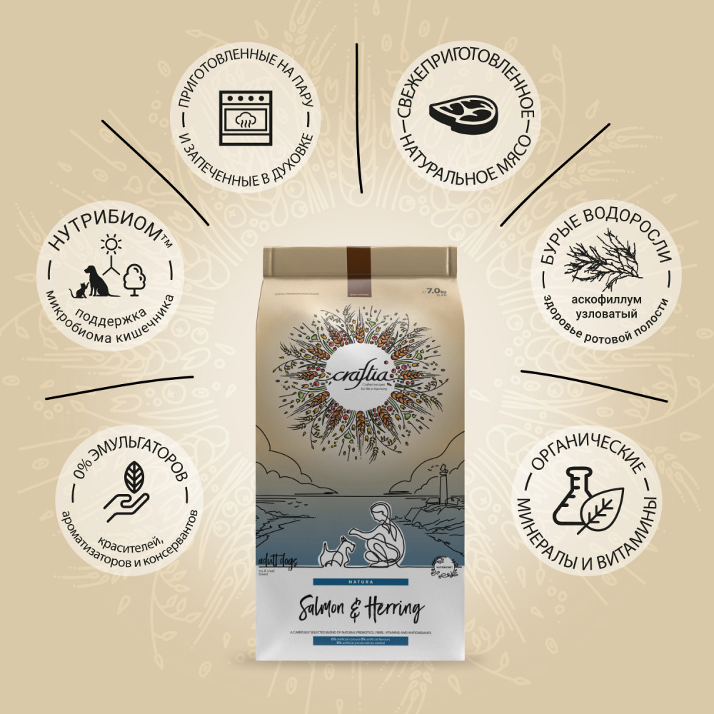 Craftia Natura — корм для собак ультрапремиум класса, созданный с любовью к природе. Состав кормов Craftia прозрачен и понятен, отсутствуют скрытые добавки и сомнительные ингредиенты. Все, что заявлено в составе корма, гарантированно присутствует в каждой грануле. Собственный завод, сотни квадратных метров научно-исследовательских лабораторий, первоклассное сырье — все это позволяет создавать тщательно сбалансированный высокобелковый корм с холистическим подходом. Все компоненты корма подходят для употребления человеком и не содержат ГМО.