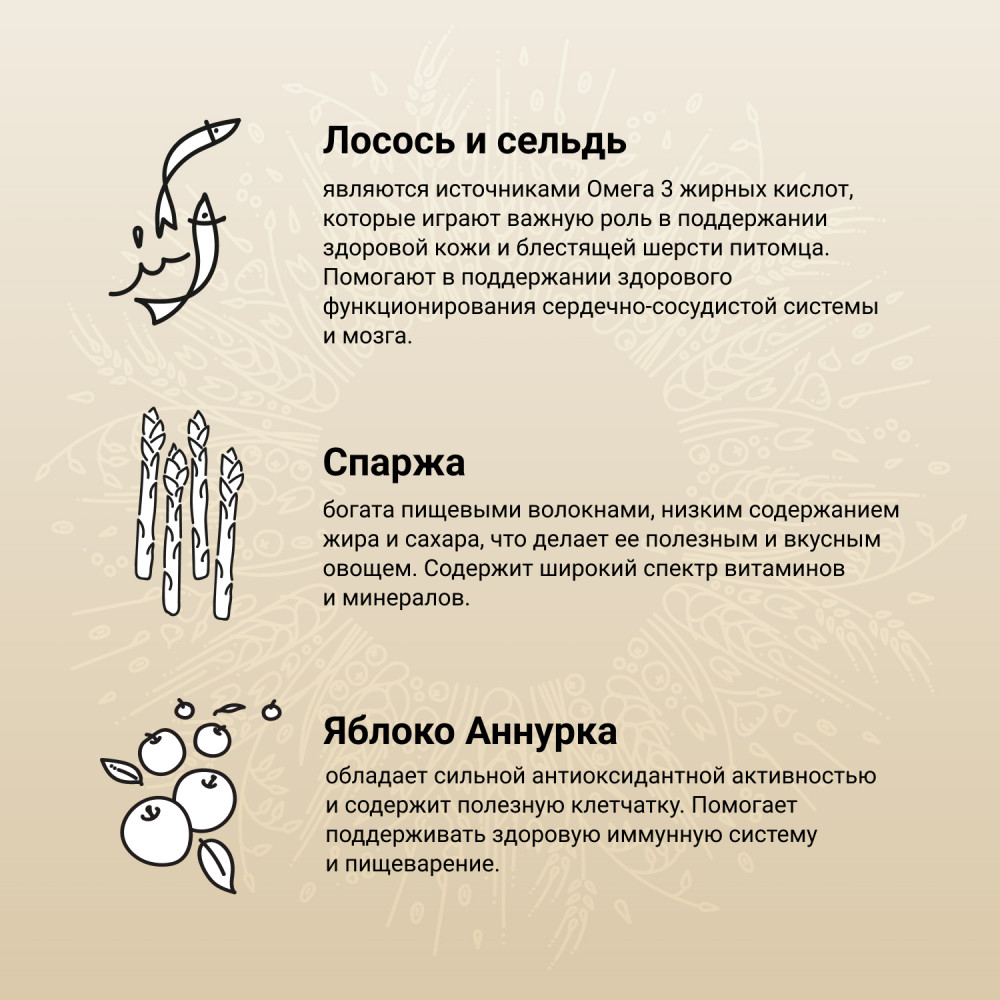 Основные источники белка в корме — лосось и сельдь. Они богаты незаменимыми Омега-3 жирными кислотами и минеральными веществами. Жирные кислоты контролируют воспалительные процессы в организме, что хорошо влияет на здоровье суставов. Легкоусвояемый рыбный белок способствует формированию крепкой мускулатуры, улучшает состояние кожи. Источники углеводов — спельта, бурый рис, ячмень, овес и просо. Специально подобраны злаки с разным гликемическим индексом, чтобы питомец дольше чувствовал себя сытым: глюкоза поступает в организм постепенно, а значит, чувство голода не наступает дольше.