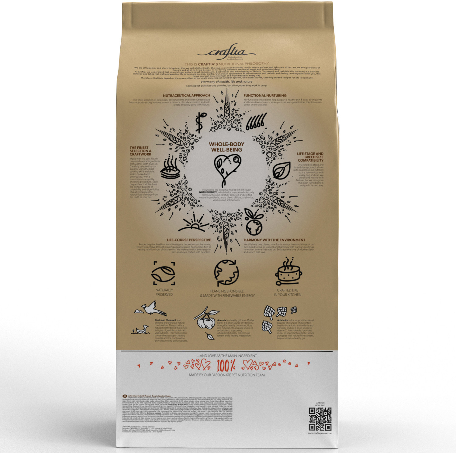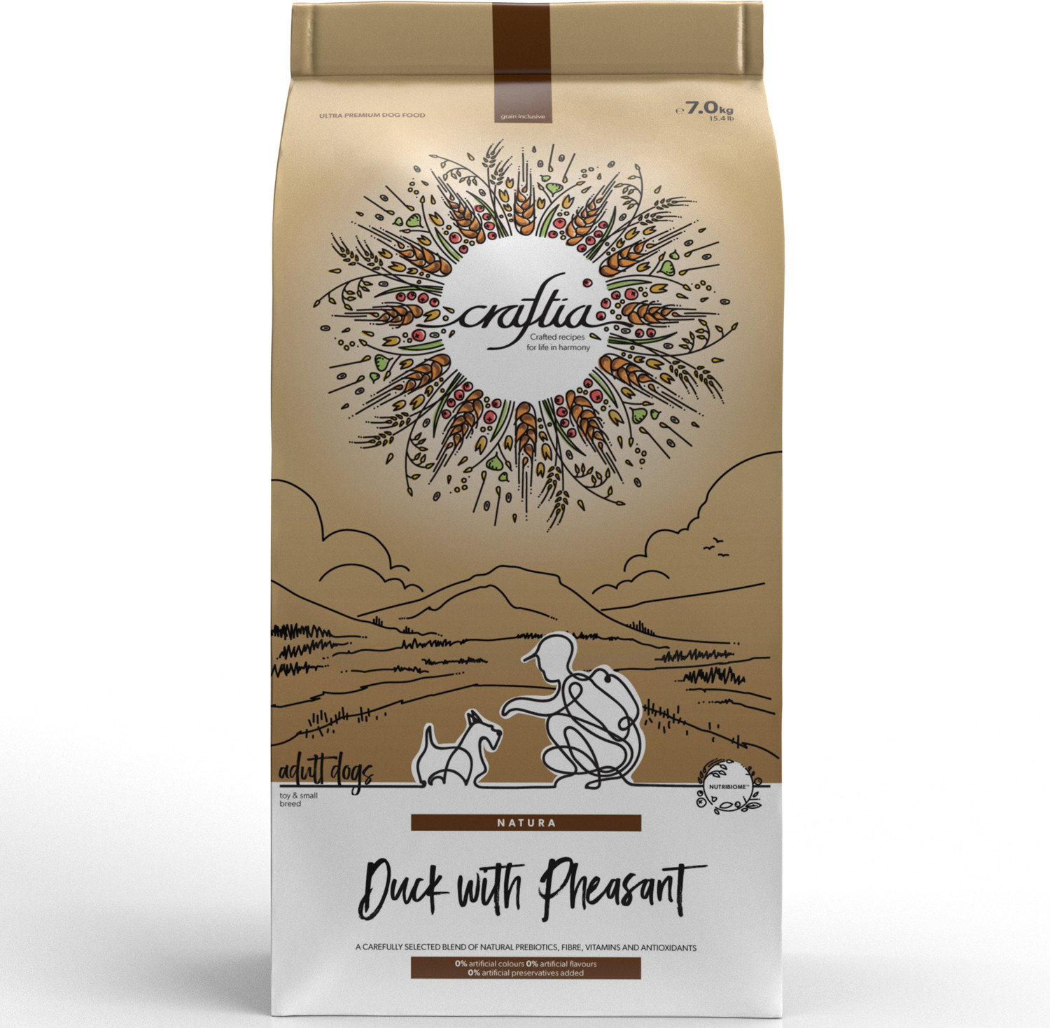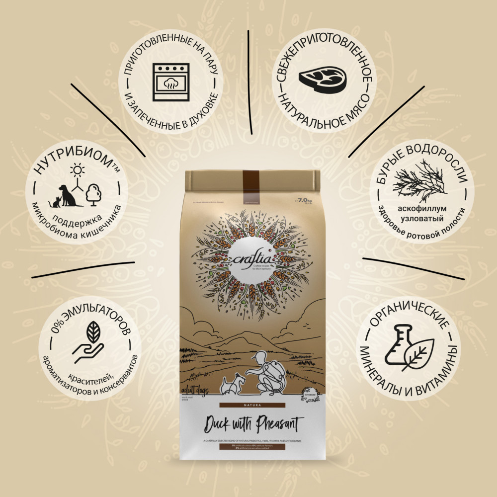 Craftia Natura — корм для собак ультрапремиум класса, созданный с любовью к природе. Состав кормов Craftia прозрачен и понятен, отсутствуют скрытые добавки и сомнительные ингредиенты. Все, что заявлено в составе корма, гарантированно присутствует в каждой грануле. Собственный завод, сотни квадратных метров научно-исследовательских лабораторий, первоклассное сырье — все это позволяет создавать тщательно сбалансированный высокобелковый корм с холистическим подходом. Все компоненты корма подходят для употребления человеком и не содержат ГМО.