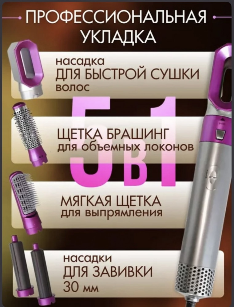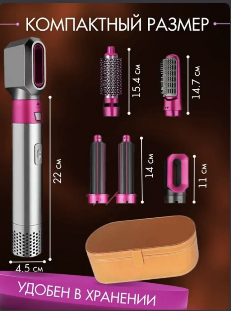 Фен для волос 5в1 с кейсом для хранения. Мультистайлер выполняет функцию сушки и профессиональную укладку волос. В комплекте имеется пять насадок - утюжок выпрямитель, щипцы для завивки кудрей, щетка расческа, брашинг и насадка для сушки волос. Забудьте о сложных и долгих процедурах укладки волос. Теперь у вас есть превосходный инструмент для моделирования волос, который с лёгкостью позволит вам создавать разные прически. Вы можете выбрать любой вид насадок, чтобы создать идеальный образ, который будет подходить вашим потребностям.  |