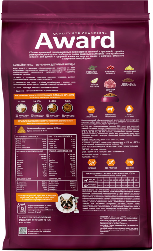 Award Корм для собак со свининой, брусникой, грушей и розмарином «Hypo»
