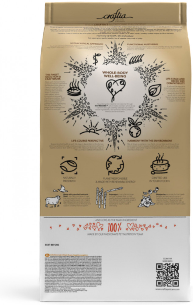 Craftia Natura — корм для собак ультрапремиум класса, созданный с любовью к природе. Состав кормов Craftia прозрачен и понятен, отсутствуют скрытые добавки и сомнительные ингредиенты. Все, что заявлено в составе корма, гарантированно присутствует в каждой грануле. Собственный завод, сотни квадратных метров научно-исследовательских лабораторий, первоклассное сырье — все это позволяет создавать тщательно сбалансированный высокобелковый корм с холистическим подходом. Все компоненты корма подходят для употребления человеком и не содержат ГМО.