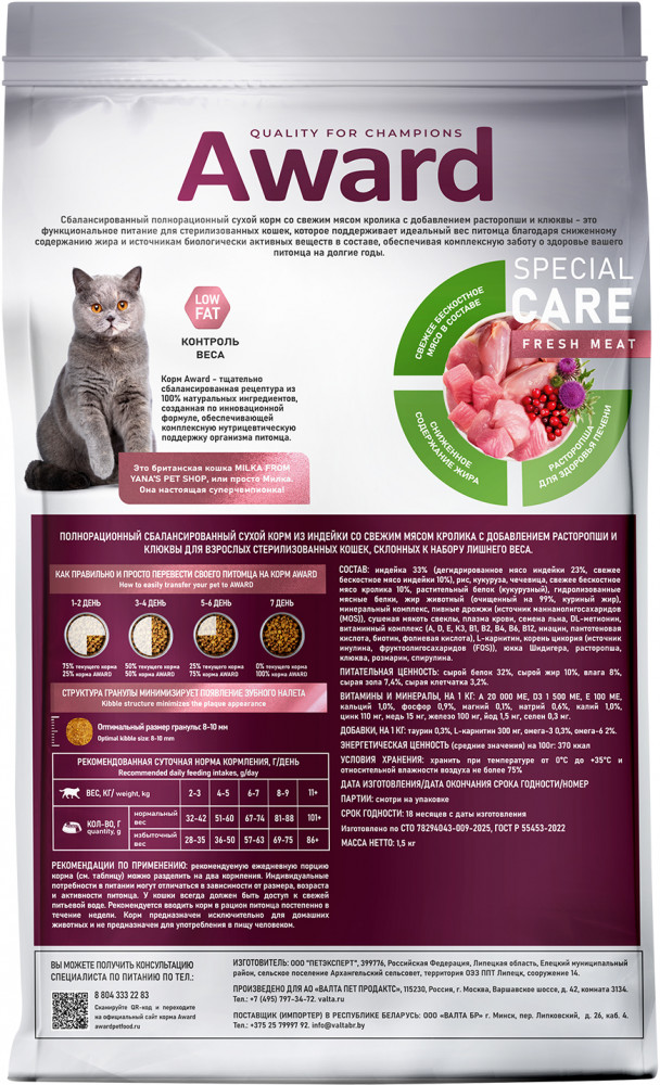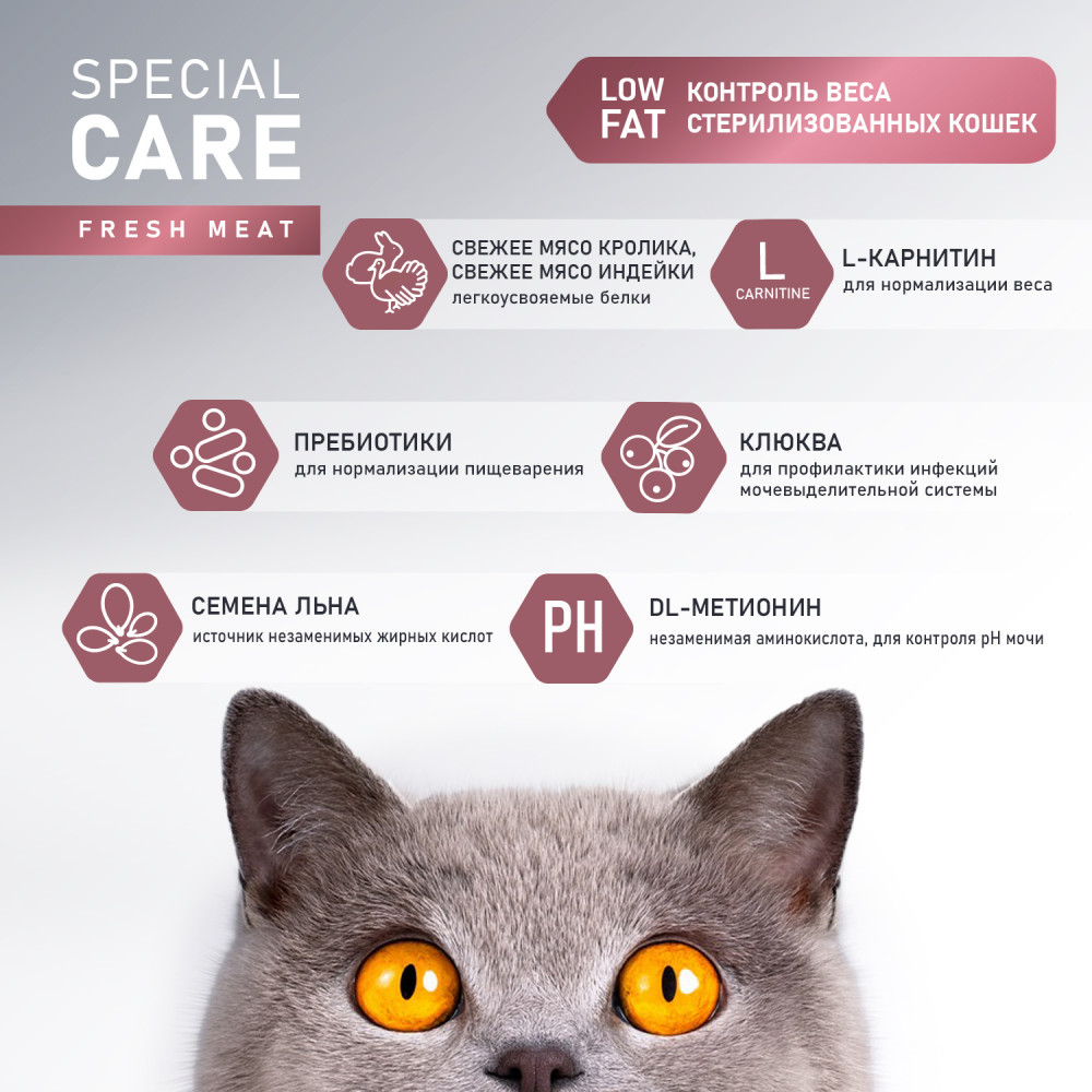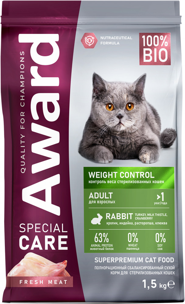 Award Корм для взрослых стерилизованных кошек со свежим мясом кролика «Special care»