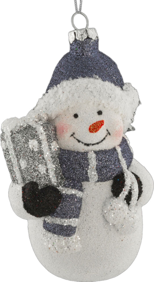 Серия: Снежная королева Снеговик выполнен из легкого пластика и полностью покрыт блестками. Шапка частично декорирована искусственным снегом. Украшение отличается интересными деталями. |