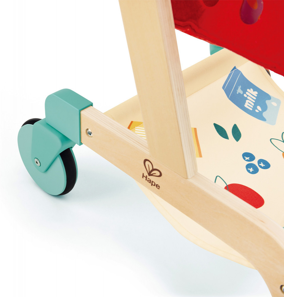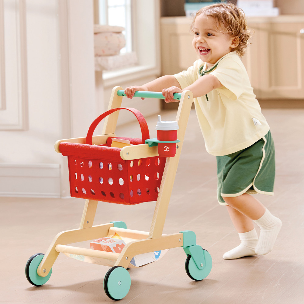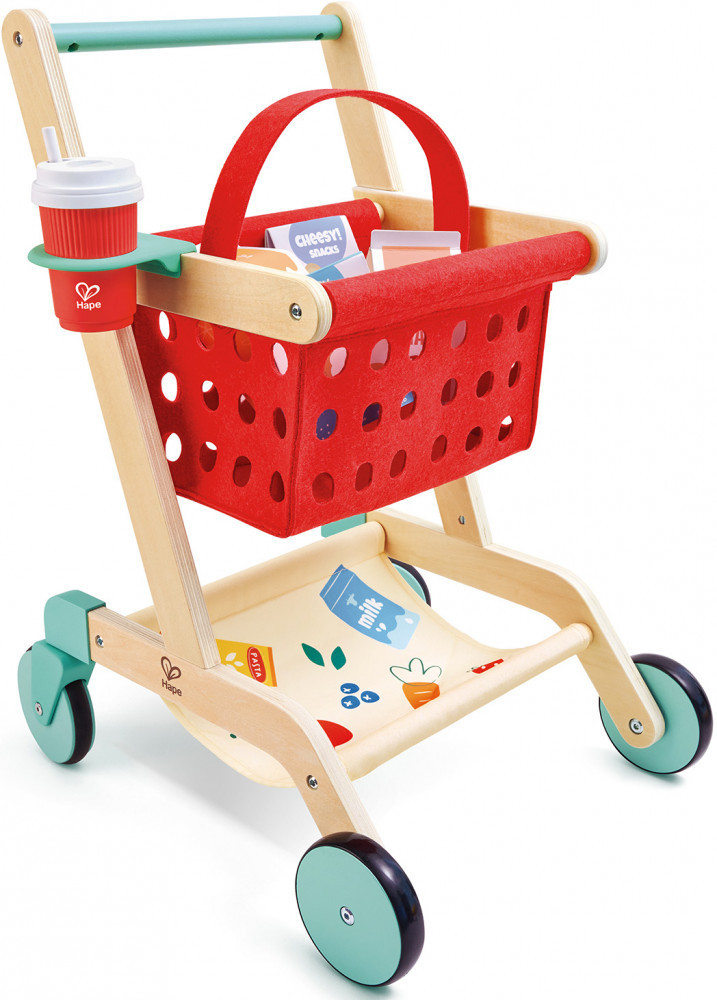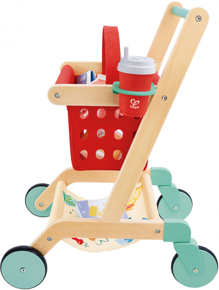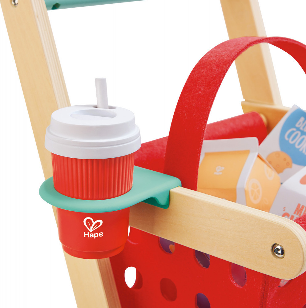 Благодаря вращающимся на 360° колёсам, тележку легко катать по дому, а тканевая корзина с прочным креплением идеально подходит для переноски игрушек или «покупок». Прочный деревянный корпус делает набор долговечным, а дополнительный держатель для чашки добавляет реалистичности — ведь маленькие покупатели тоже хотят взять с собой напиток!