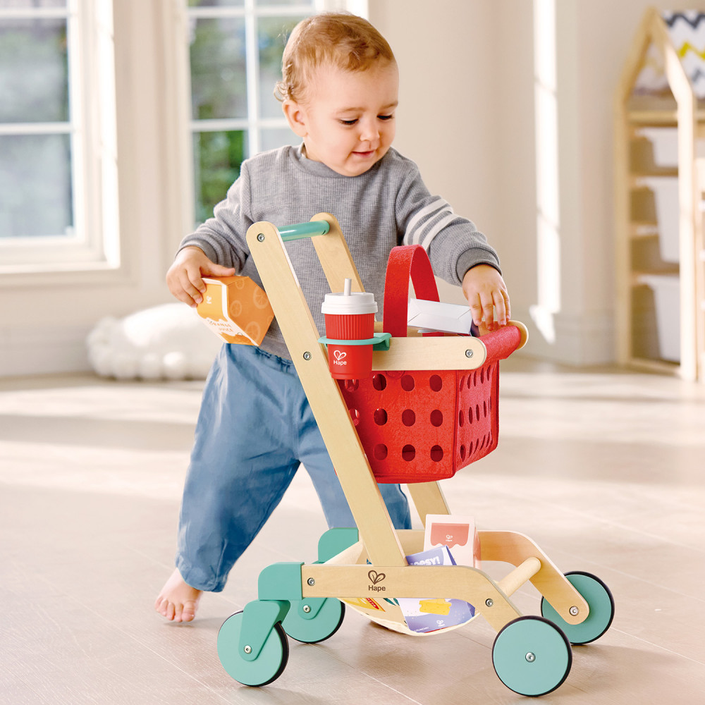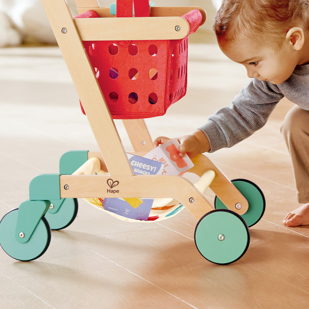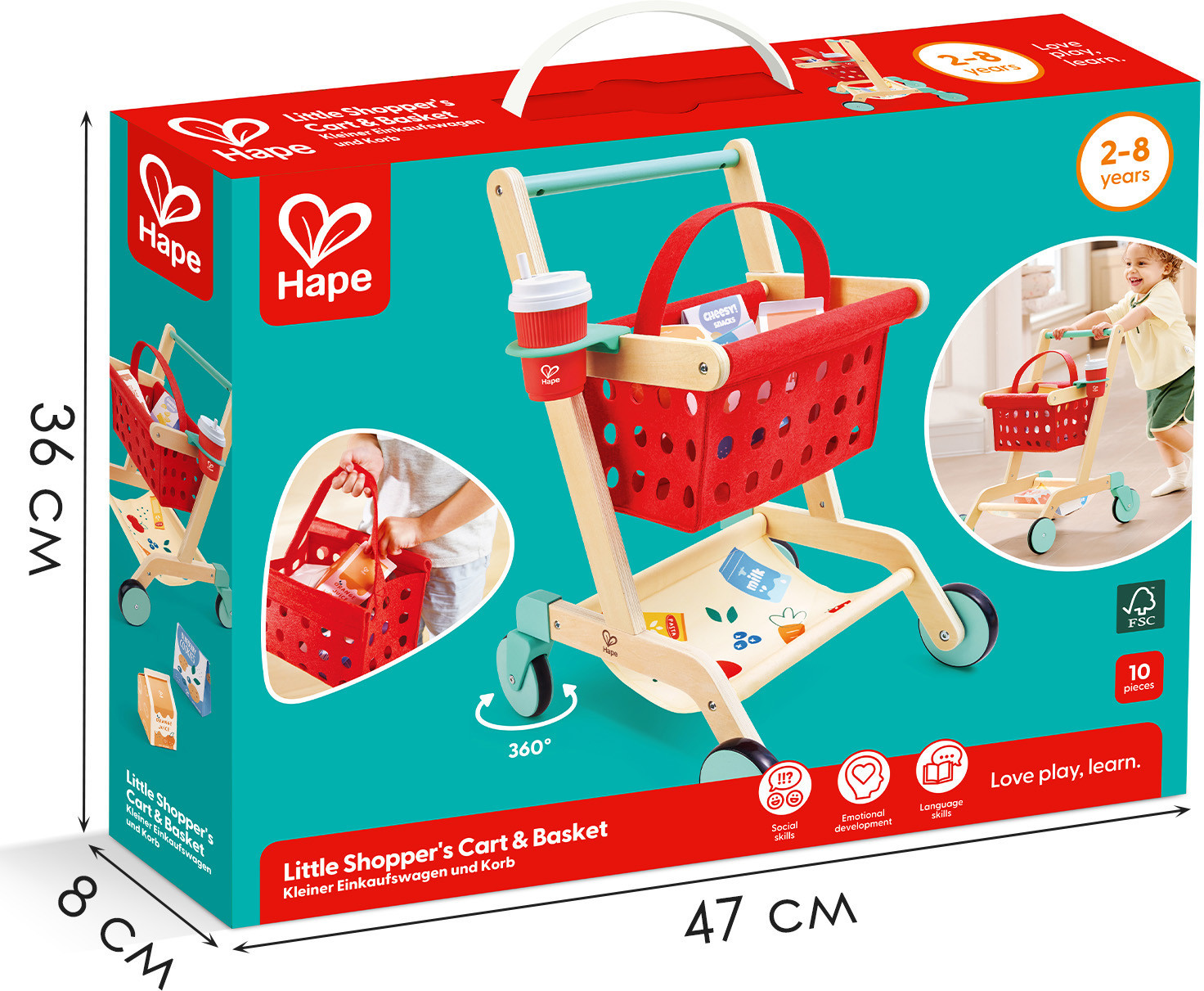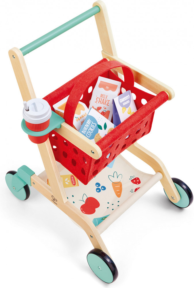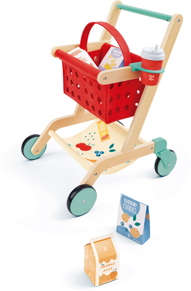 Благодаря вращающимся на 360° колёсам, тележку легко катать по дому, а тканевая корзина с прочным креплением идеально подходит для переноски игрушек или «покупок». Прочный деревянный корпус делает набор долговечным, а дополнительный держатель для чашки добавляет реалистичности — ведь маленькие покупатели тоже хотят взять с собой напиток!