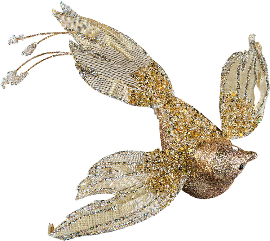 Елочное украшение Птица счастья от Christmas DeLuxe — это изысканное украшение, выполненное в золотистых тонах с использованием бисера. Его размеры составляют 18×25 см, что делает его заметным элементом декора. Украшение оснащено клипсой, что позволяет легко закрепить его на елке. Эта декоративная птица выполнена в золотистых тонах и украшена блестящими элементами, такими как бисер и пайетки. Она имеет изящные крылья с прозрачными вставками, которые создают эффект легкости и воздушности. Хвост птицы украшен мелкими по-особенному, что добавляет ей утонченности. Птица выглядит как символ счастья и праздника, идеально подходящий для украшения новогодней елки или интерьера. Ее золотистый цвет и блеск делают ее особенно привлекательной и роскошной.