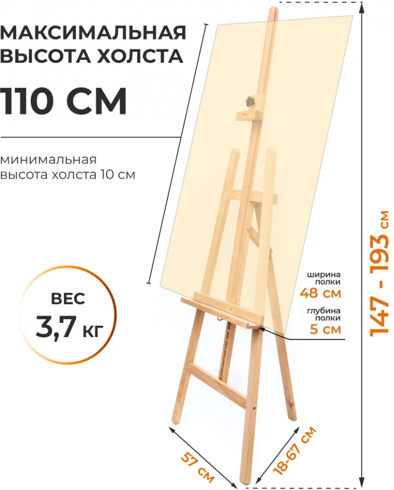 Подходит для детей, учеников, любителям и профессионалам, для занятий живописью, рисованию по номерам, идеально для плэнера или просто для тех, кто хочет приобрести себе классический мольберт. Прекрасно подходит в качестве подарка дочке, сыну, внучке или внуку на праздник. Мольберт для живописи долговечен и удобен в использовании. Ширина и глубина основания — 57 см, ширина полки — 48 см.